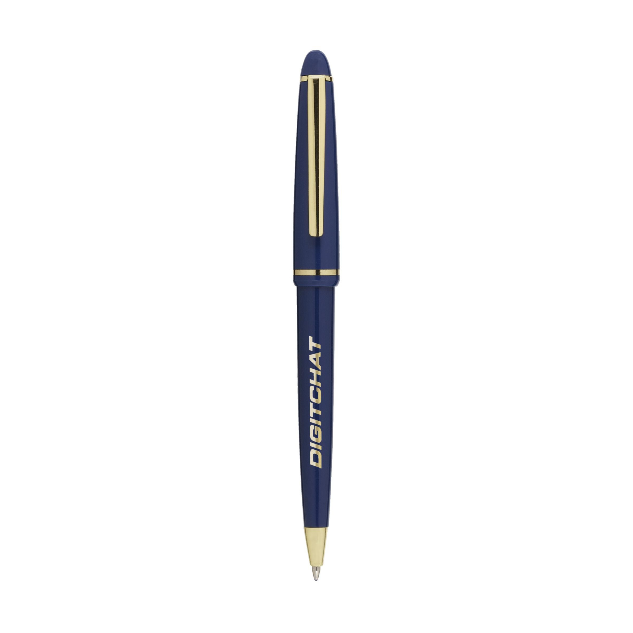 Sinisellä musteella varustettu kuulakärkikynä kiillotetulla piippulla, kullatulla koristeellisella pidikkeellä ja kärjellä ja kierteellä.