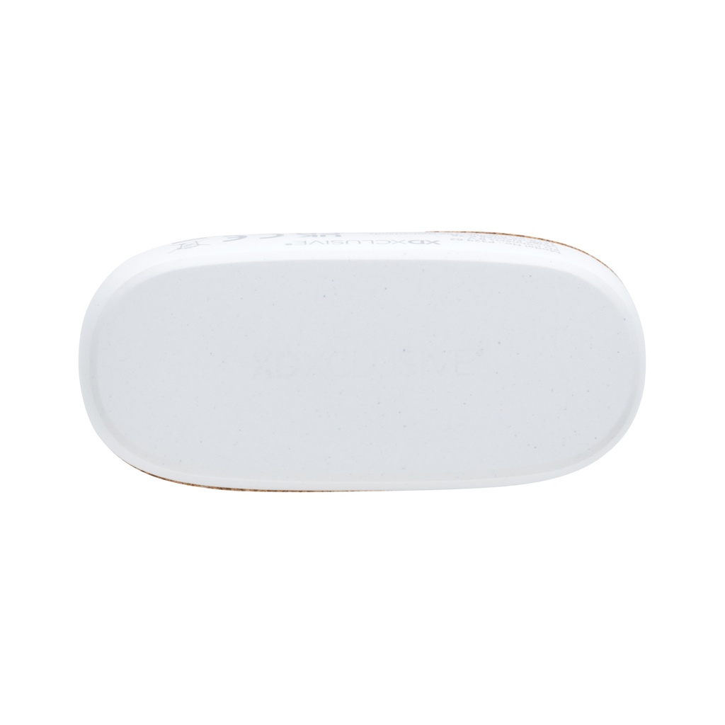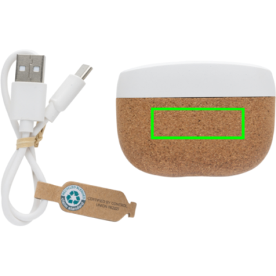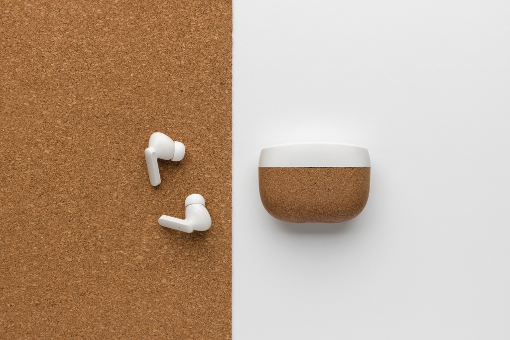 Langattomat kuulokkeet elegantilla muotoilulla. Valmistettu FSC® 100% korkista ja RCS (Recycled Claim Standard) sertifioidusta kierrätetystä ABS-muovista. Kierrätetyn materiaalin kokonaismäärä: 35% tuotteen kokonaispainosta. RCS-sertifikaatti takaa kierrätysmateriaalien täysin sertifioidun toimitusketjun. Täysin sopivat kuulokkeet, joissa on 35 mAh akku, joka voidaan ladata 300 mAh latauskotelossa 1,5 tunnissa. Automaattinen yhdistäminen, joten kuulokkeet on helppo yhdistää mobiililaitteeseen. Toistoaika keskimmäisellä äänenvoimakkuudella noin 3 tuntia. BT 5.3 mahdollistaa optimaalisen yhteyden. Toimintamatka jopa 10 metriä. Mikrofoni ja vastaustoiminto. Mukana 3 kokoa silikonisia korvapehmusteita. Mukana RCS-sertifioitu kierrätetty TPE-latauskaapeli. Pakattu FSC® mix kraft-pakkaukseen. Tuote ja tarvikkeet ovat 100% PVC-vapaita.