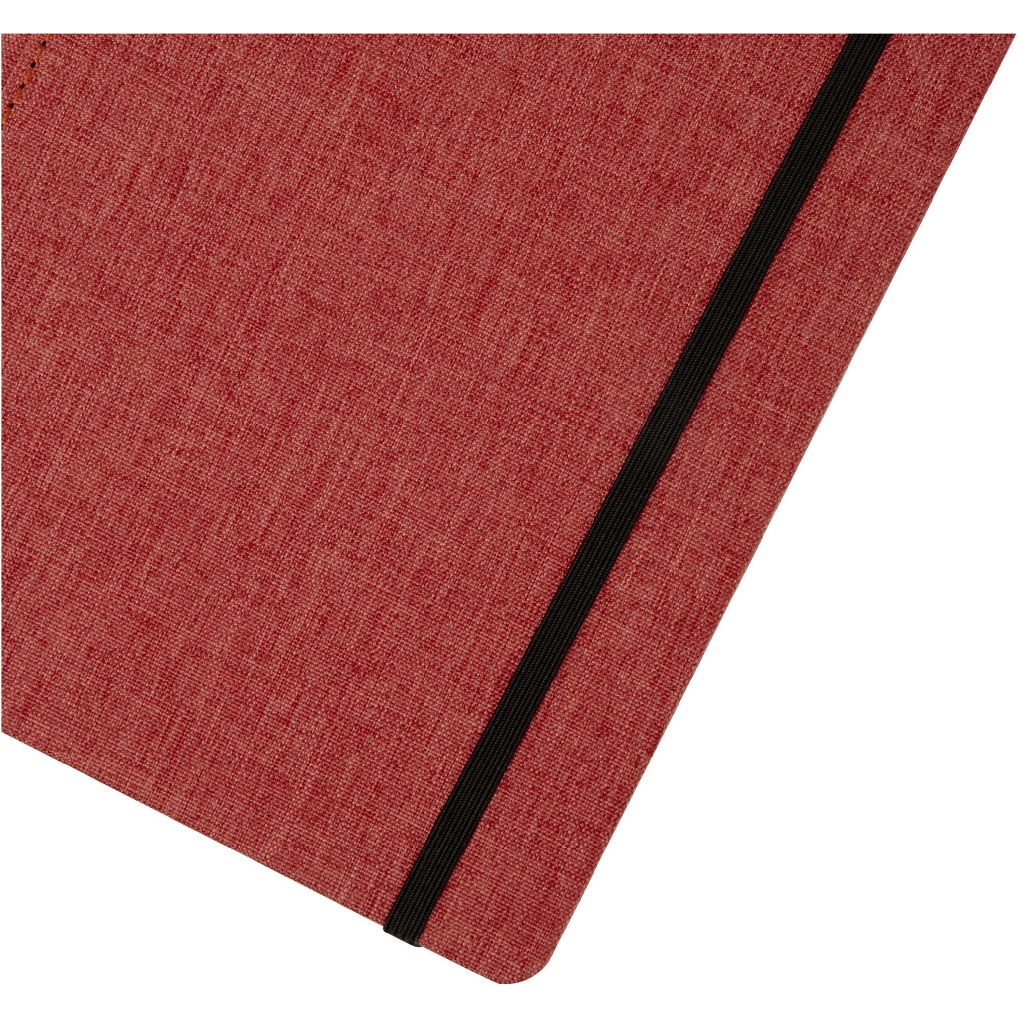 A5-kokoinen muistikirja, jonka kansi on valmistettu RPET-kankaasta. Sisältää 96 arkkia, 70 g/m², kierrätettyä viivapaperia, kynäpidike ja nauhamerkki. Pakattu kartonkisuojukseen.