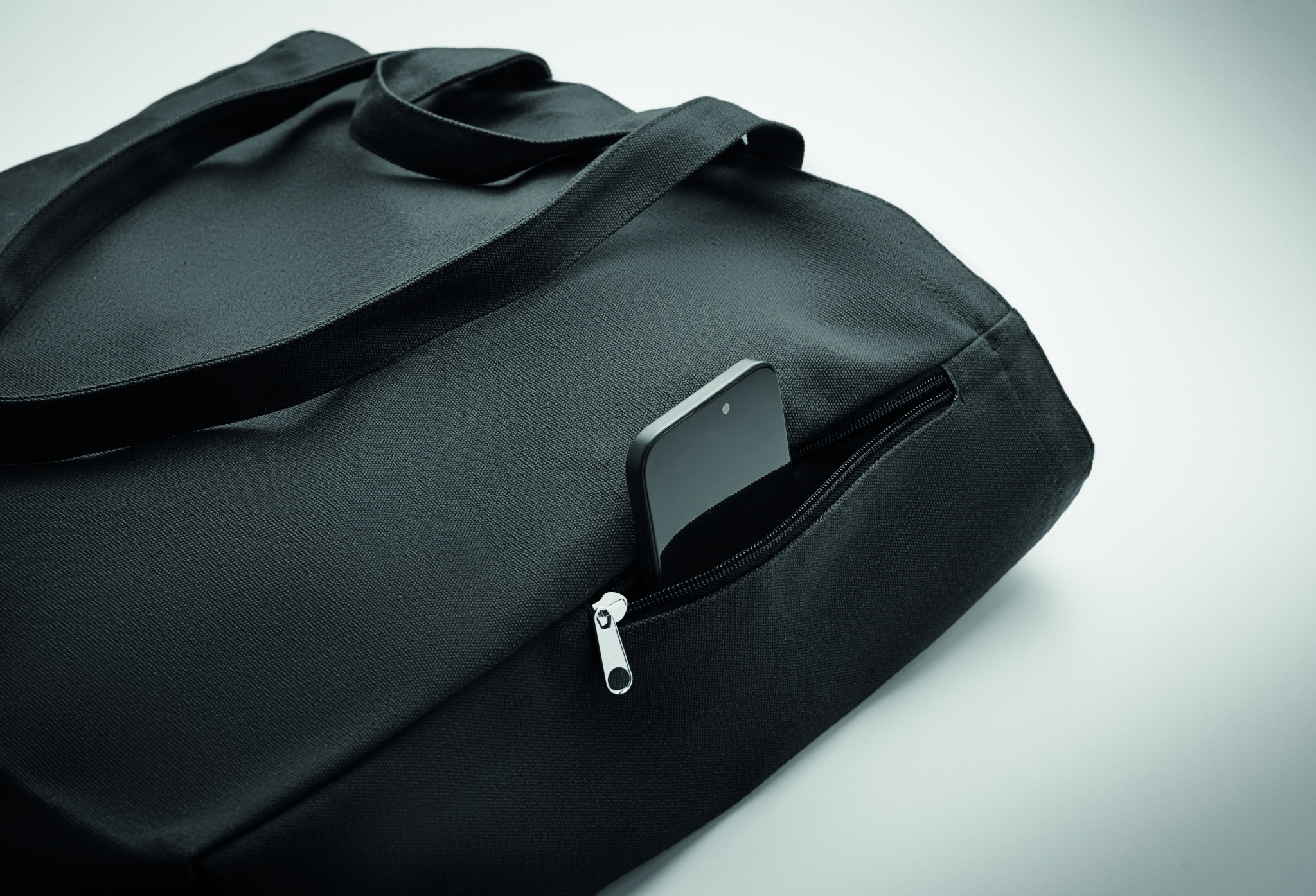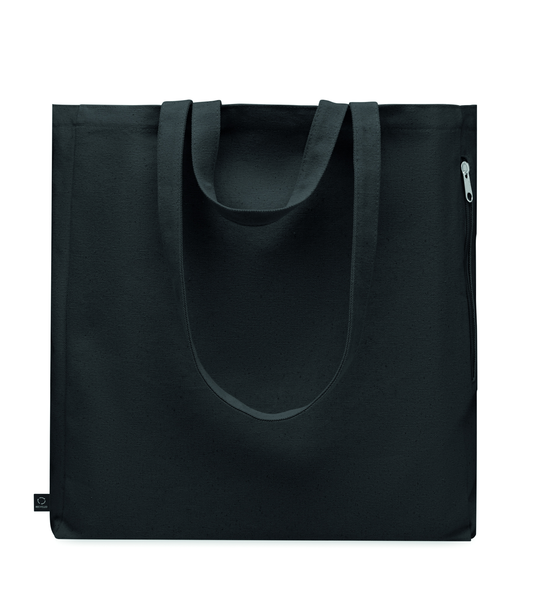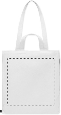 Kierrätysmateriaalista valmistettu ostos- tai rantakassi lyhyillä kantokahvoilla. Kassissa on vetoketjullinen sivutasku. Materiaali 70 % kierrätettyä puuvillaa/ 30 % kierrätettyä polyesteriä, 380 gr/m².