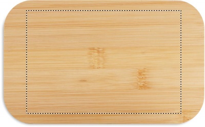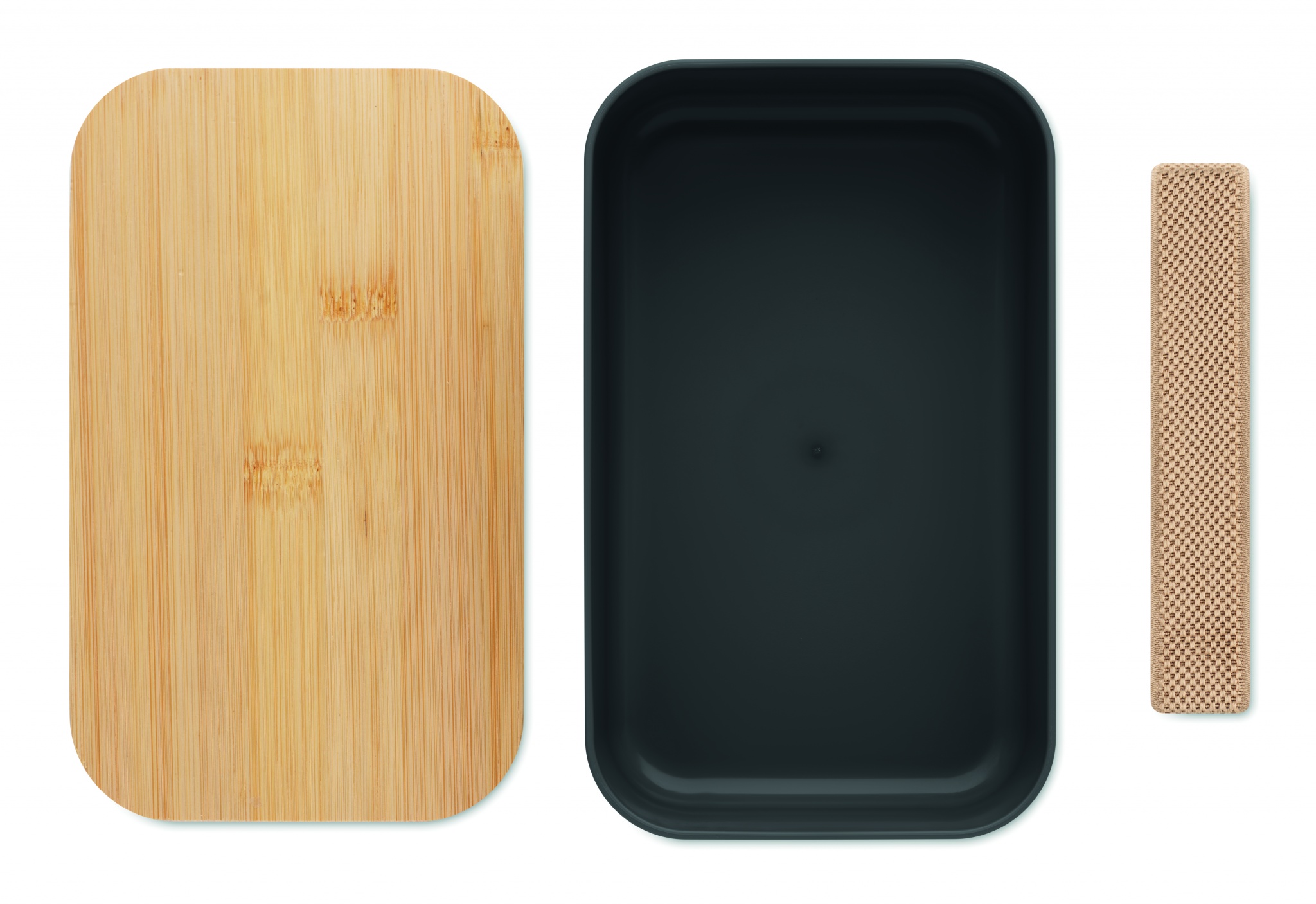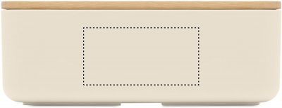 100 % PLA-maissi lounasrasia, jossa bambukansi ja RPET-kuminauhakiinnitys. Tilavuus: 1000 ml.