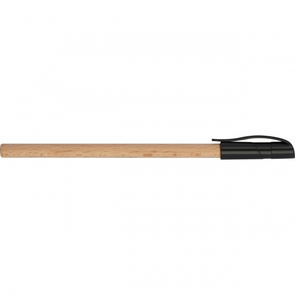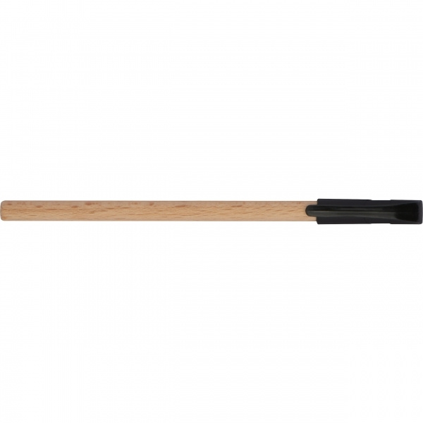 Kätevä, puusta valmistettu musta kirjoituskuulakynä mustalla muovikorkilla. Logosi kaiverretaan.