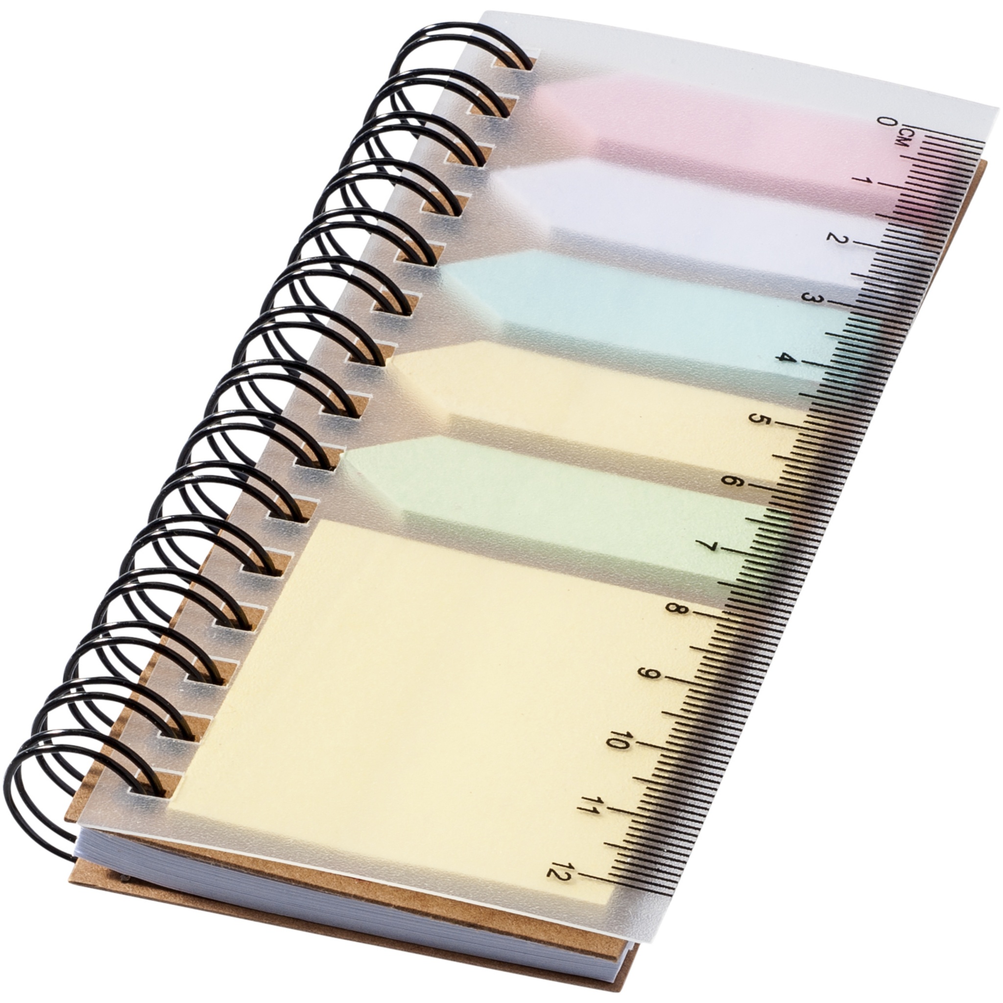 Tarranippu, jossa on 25 viisi eriväristä tarralappua, 25 tarrapaperia ja 50 sivua viivoitettua valkoista sivua. Etukannessa viivoitin.