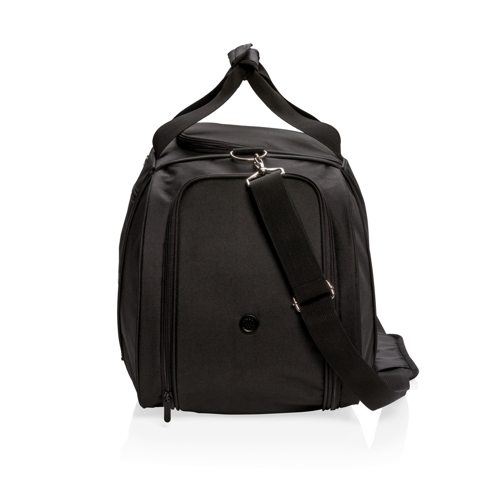 Tämä 600D ja 168D polyesterinen duffelikassi tarjoaa urheilullista tyyliä kuntosalia tai vapaa-ajan matkailua varten. Sisältää tilavan pääosaston U-muotoisella vetoketjukannella, sivusta käytettävän kenkäosaston ilma-aukolla ja sivuosaston juomapulloa varten. Etupuolella vetoketjullinen piilotettava tasku älypuhelimia ja muita matkatavaroita varten. Säädettävä olkahihna ja kaksinkertaiset kantokahvat mukavaa ja monipuolista kantamista varten. Ei sisällä PVC:tä.