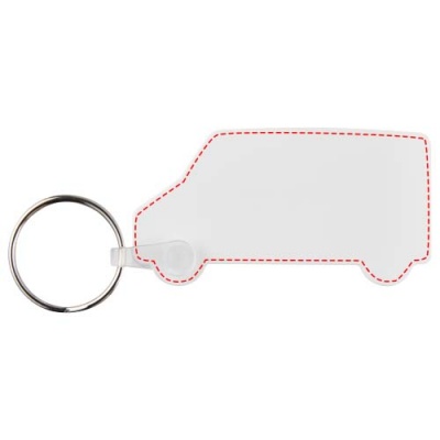 Valkoinen pakettiauton muotoinen avaimenperä, jossa on metallinen avainrengas. Metallirengas tekee profiilista litteän, mikä on ihanteellista postituksen kannalta.