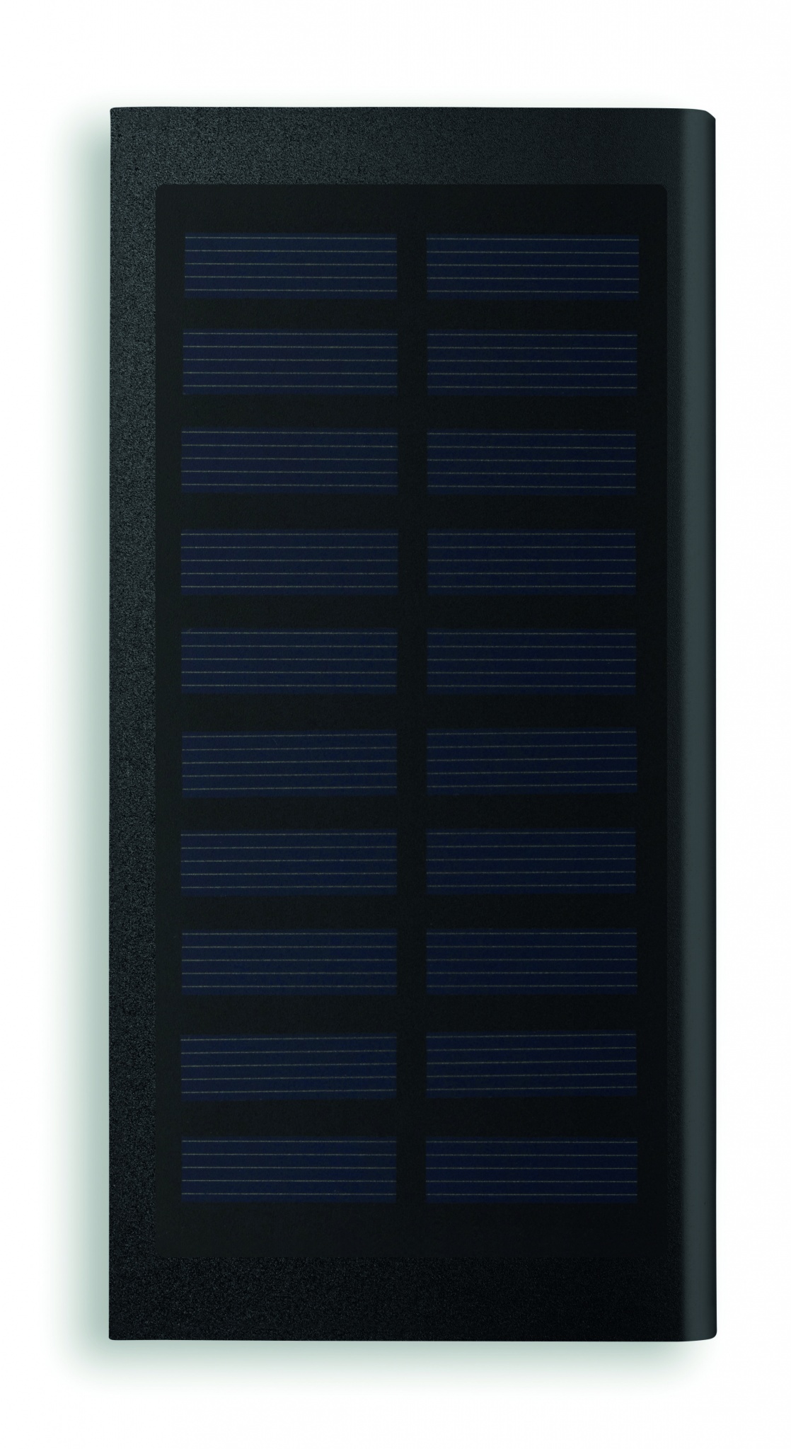 Alumiininen 8000 mAh varavirtalähde aurinkopaneelilla. Kapasiteetti älypuhelinkäyttöön, lähtövirta DC5V / 1A ja DC5V / 2A. Sisältää merkkivalon ja USB-kaapelin mikro USB-liittimellä.