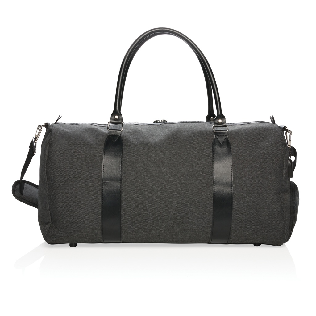 Moderni ja minimalistinen 600D polyesterinen viikonloppulaukku PU kahvoilla ja mukavalla olkahihnalla. Suuri pääosasto, jossa tilaa kaikille tavaroille viikonlopun viettoa varten. Yhdistä varavirtalähteesi helposti integroituun USB A-latausporttiin ja lataa puhelimesi tai tablettisi matkan aikana. Tuotteen oikealla puolella kätevä tasku. PVC-vapaa.