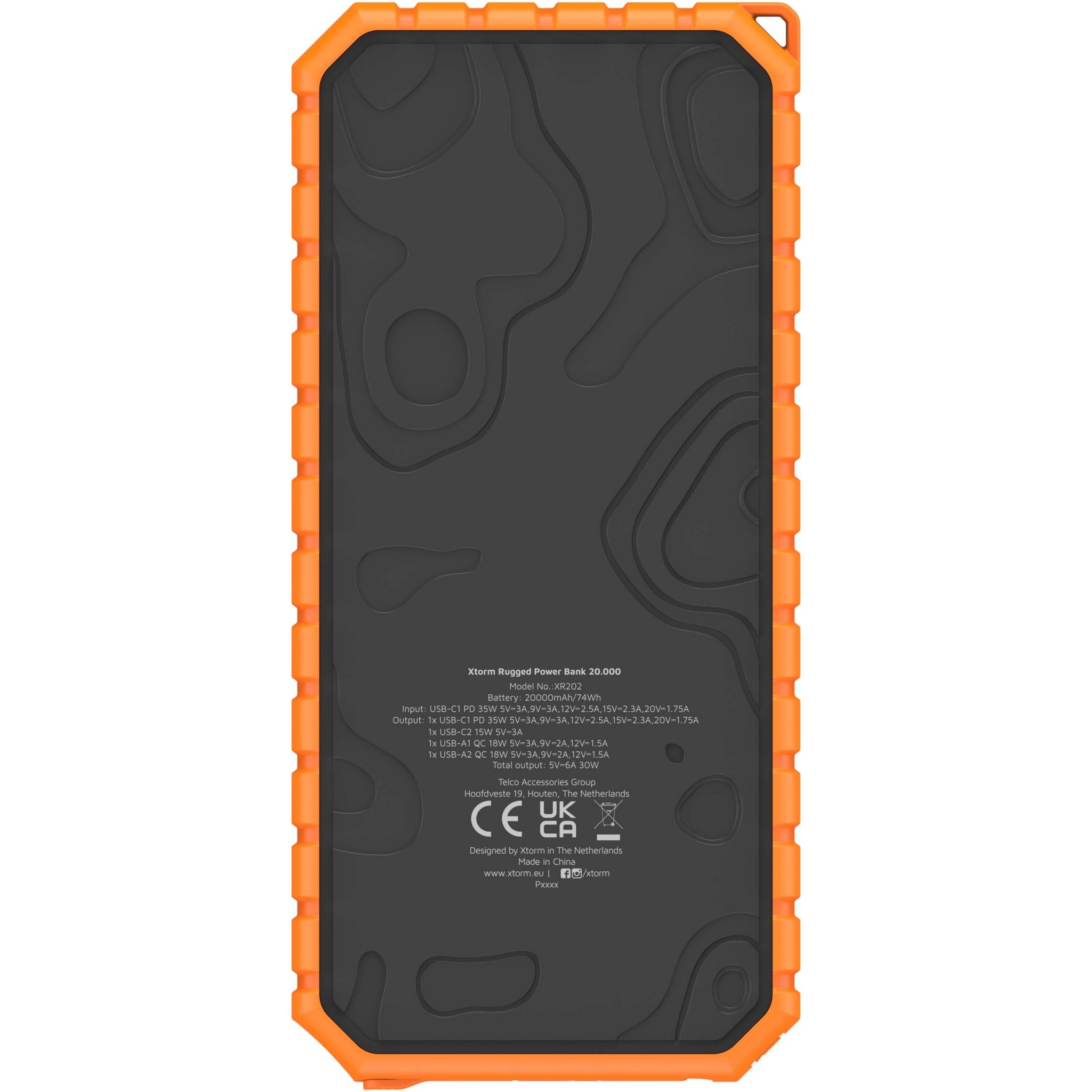 Xtorm XR202 Xtreme 20 000 mAh 35 W QC3.0 vedenpitävä ja kestävä varavirtalähde taskulampulla, Tasainen musta/oranssi