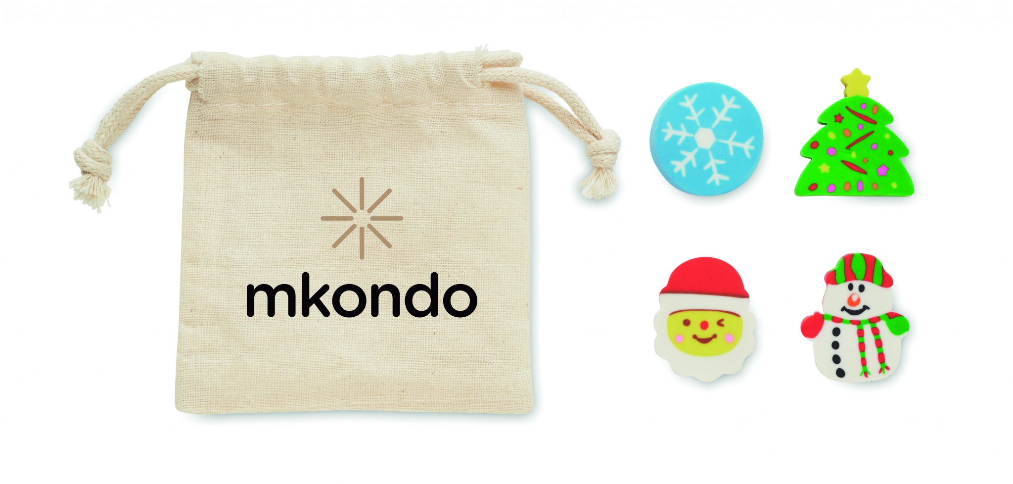 4 skirtingų kalėdinių trintukų rinkinys: snaigė, Kalėdų senelis, eglutė ir sniego senelis. Pateikiamas medvilniniame maišelyje su virvelėmis.