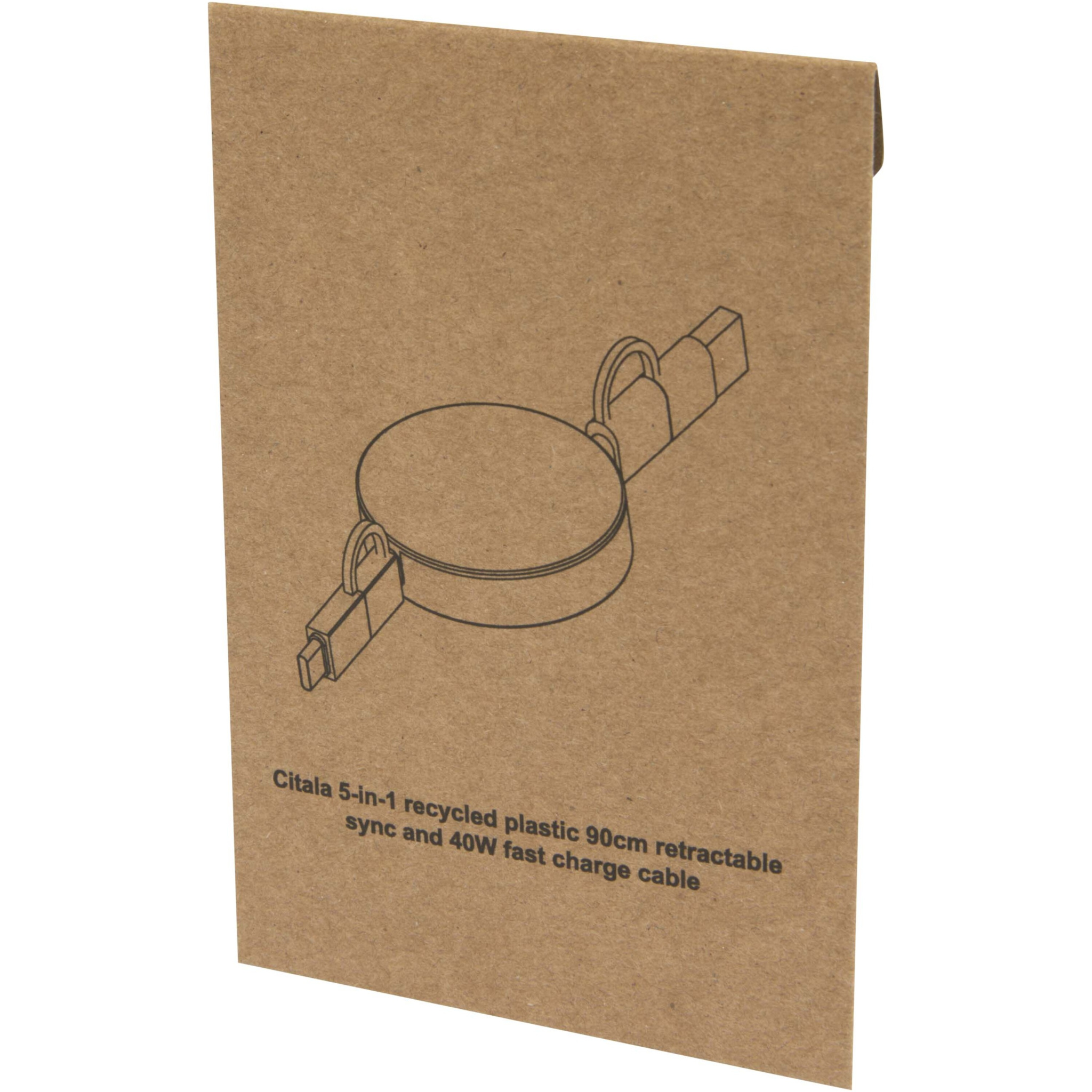 Citala 5-in-1 ištraukiamas duomenų sinchronizavimas ir 40 W greito įkrovimo laidas yra pagamintas iš perdirbto plastiko. Kabelis turi USB-A ir C tipo įvesties jungtis kartu su 2-in-1 Type-C ir Lightning/Micro USB kombinuota išvesties jungtimi. Iš USB-C į USB-C išvesties galia yra ne didesnė kaip 40 W, nuo USB-A iki USB-C – iki 18 W, o visos kitos prijungimo parinktys – iki 15 W. Suderinamas su CarPlay ir Android Auto. Nesvarbu, ar esate namuose, biure ar keliaujate, Citala laidas užtikrina našumą ir stilių vienoje kompaktiškoje pakuotėje. Kabelio ilgis: 90 cm.