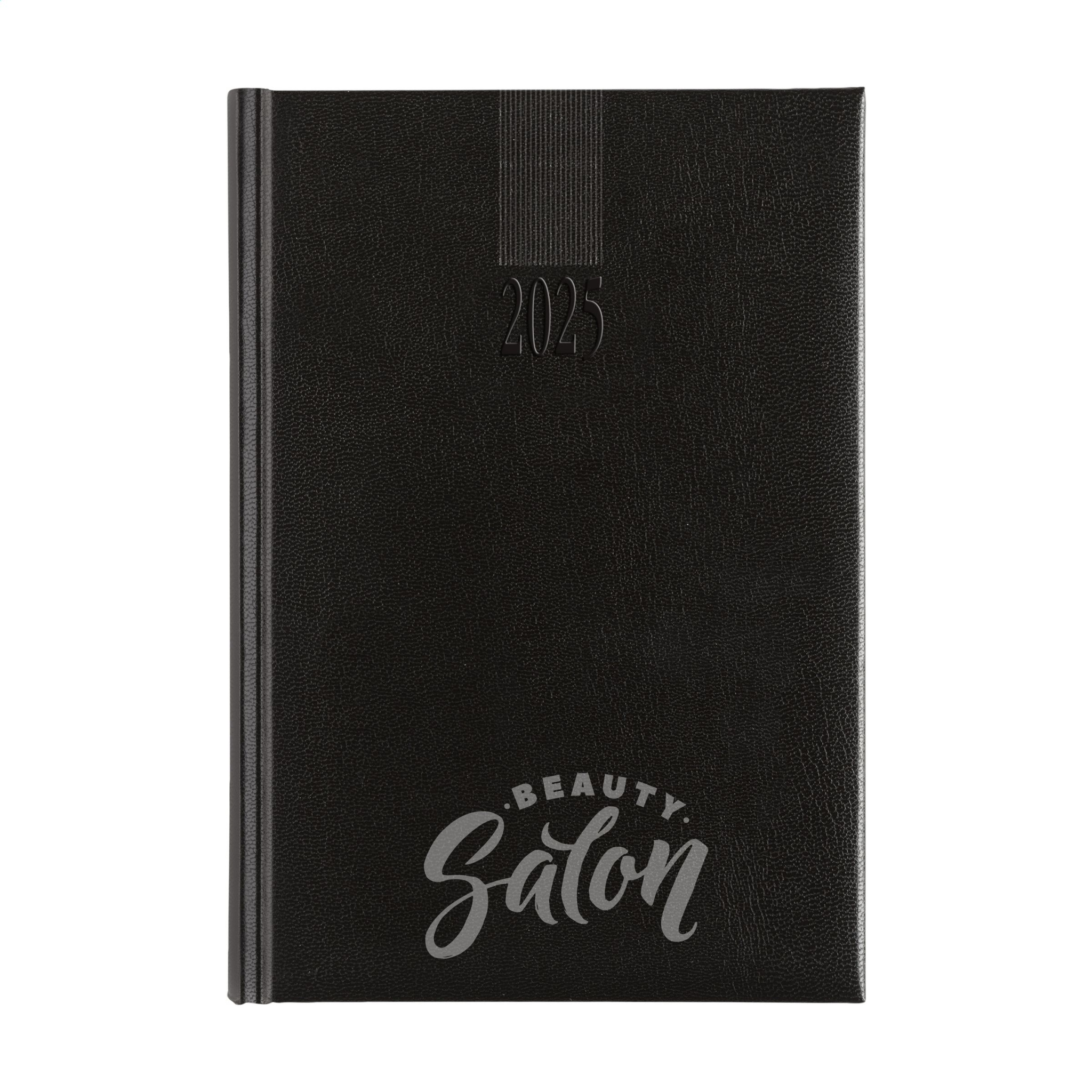 Šešių kalbų biuro dienoraštis: EN, NL, F, D, I ir ES. Su patvariu paminkštintu Balacron dangteliu ir priekyje dekoratyviais įspaudais metais, 70 g baltas, FSC Mix sertifikuotas popierius, spausdintas 2 spalvomis, įrištas siūlais, su nuplėšiamais kampais, viena diena puslapyje (šeštadienis ir sekmadienis kartu), metai planuotojas einamieji metai ir 2 kitų metų ketvirčiai, pažymėkite vietą kiekvienai dienai, papildomus naudingos informacijos puslapius. Beveik A5 dydžio.