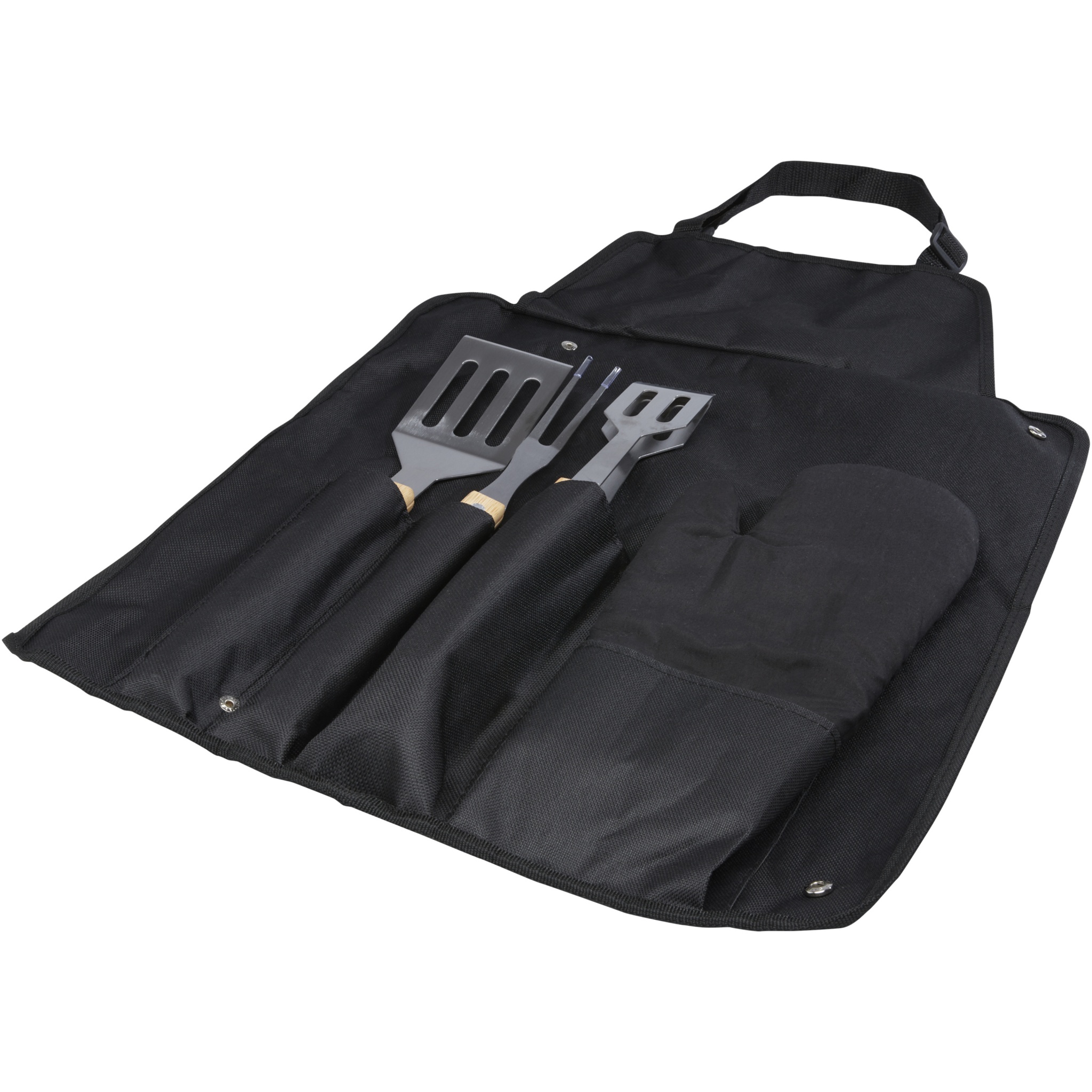 5-daļīgs BBQ komplekts ar lāpstu (36,5 x 7 cm), dakšiņu (36,5 x 2 cm), knaibles (36,5 x 5 cm), cimdu (25 x 16 cm) un priekšautu ar maisiņu (42 x 60 cm) . Rokturi ir izgatavoti no bambusa, kas ir iegūts un ražots saskaņā ar ilgtspējīgiem standartiem.