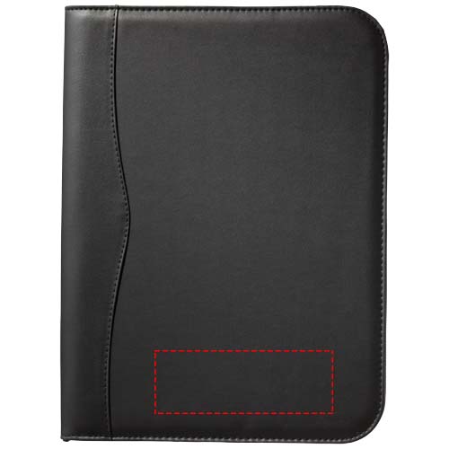 Ideāls priekšmets, ar kuru katrs darbinieks netieši veicina katra zīmola lielāku atpazīstamību: Ebony portfolio. A4 izmēra portfelī ir ērts nodalījums, kā arī rāvējslēdzēja kabata dokumentu glabāšanai. Blakus tam ir 20 lappušu piezīmju bloks, kā arī pildspalvas cilpa (pildspalva un piederumi nav iekļauti komplektā). Aizveriet portfeli ar rāvējslēdzēju, lai saturs būtu kārtīgs un labi aizsargāts. Portfelis ir izgatavots no izturīgas ādas imitācijas un piedāvā daudz vietas lieliem logotipiem.