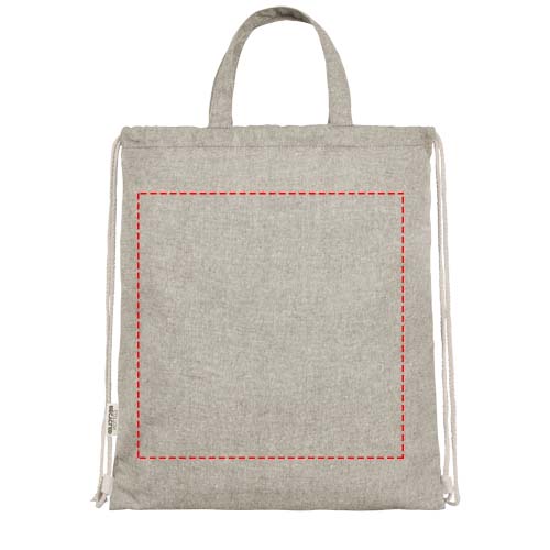 Savelkamās auklas soma izgatavota no 150 g/m² pārstrādāta kokvilnas poliestera maisījuma. Liels galvenais nodalījums ar kokvilnas aukliņu aizdari dabīgā krāsā. Pārstrādāta kokvilna tiek ražota no pirmspatērēšanas atkritumiem, kas radušies tekstilrūpnīcās griešanas procesā. Līdzīgas krāsas tiek sajauktas kopā, tāpēc nav nepieciešama papildu krāsošana. Pārstrādātās kokvilnas rakstura dēļ var būt ļoti nelielas krāsas atšķirības. Tas nepārprotami piešķir autentiskāku izskatu. Katrai mugursomai ir arī Aware™ marķieris. Šī novatoriskā funkcija ļauj lietotājiem izsekot preces izcelsmei un gaitai, izmantojot QR kodu, uzlabojot piegādes ķēdes pārredzamību un veicinot ciešāku saikni starp produktu un tā ražošanas procesu. Izturība līdz 5 kg svaram. Roktura garums: 14 cm.