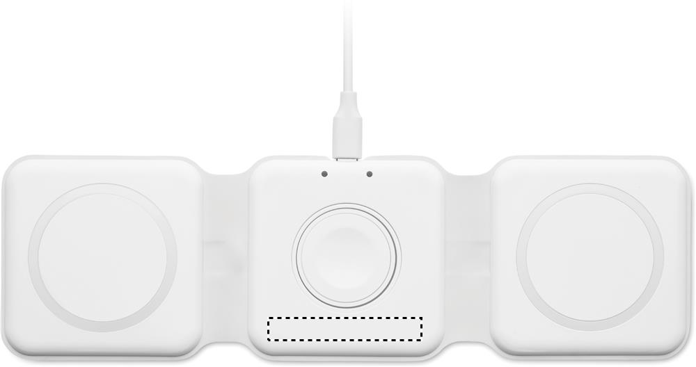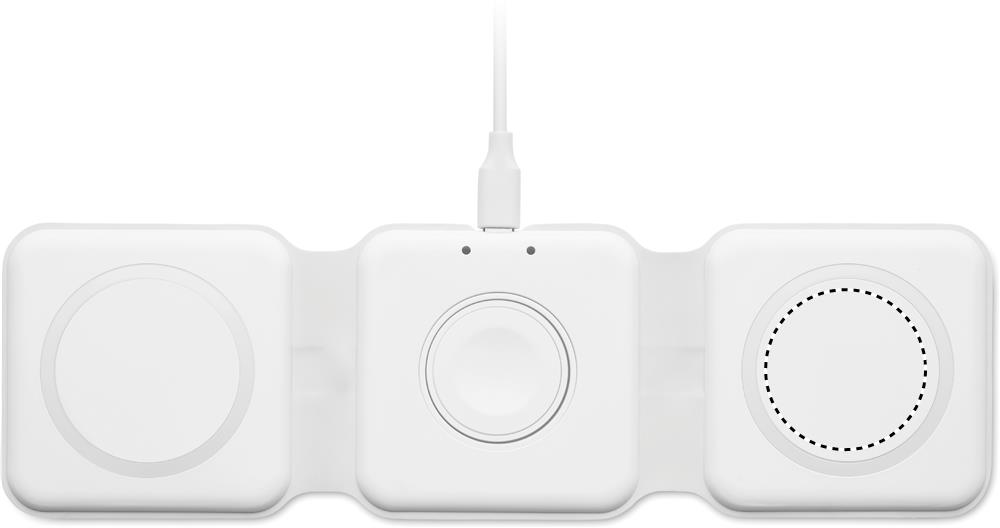 3 vienā salokāma ABS uzlādes stacija. Tam ir 3 bezvadu uzlādes punkti (15 W). Ievade: 2-in-1 Type-C un Type-A. Savietojams ar visām QI iespējotām ierīcēm, piemēram, jaunākajām Android ierīcēm, iPhone® 8, X un jaunākām ierīcēm. Saderīgs arī ar iWatch.