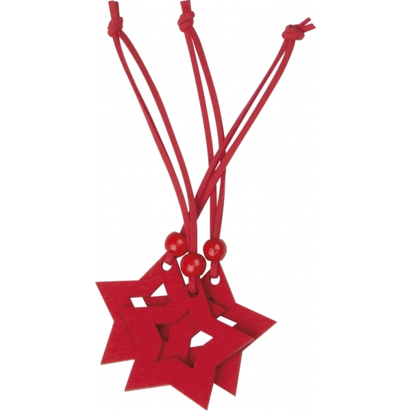 Trīs sarkanu filca zvaigžņu komplekts ar auklu un koka pērli, dekoratīvs ne tikai Ziemassvētku sezonai. Jūsu logotips tiks uzklāts uz atsevišķa iepakojuma pēc etiķetes.