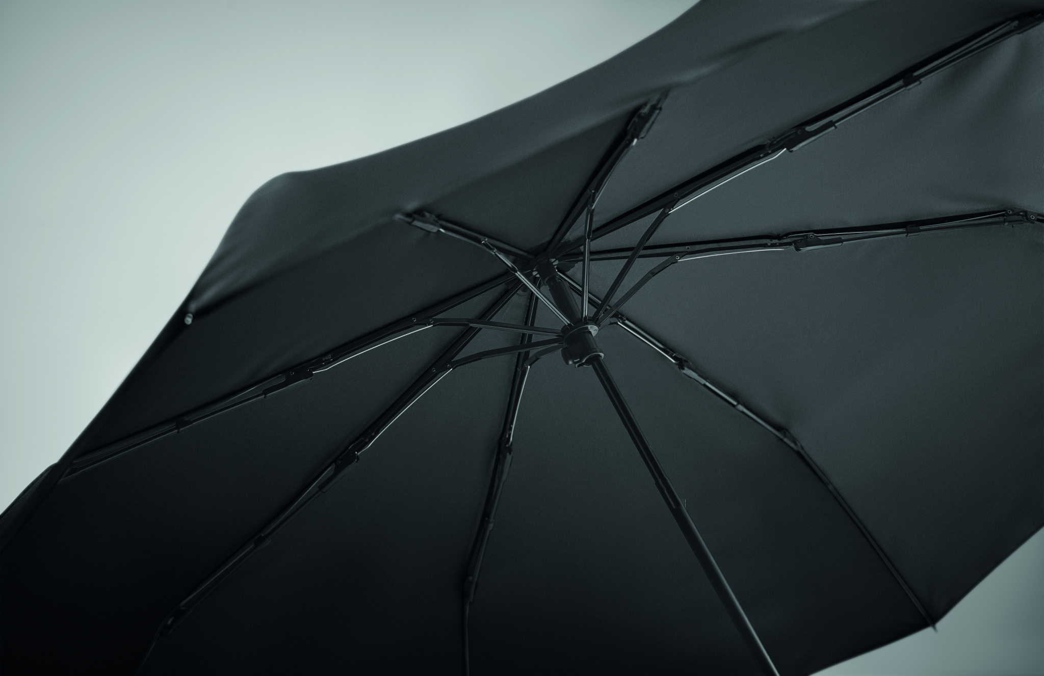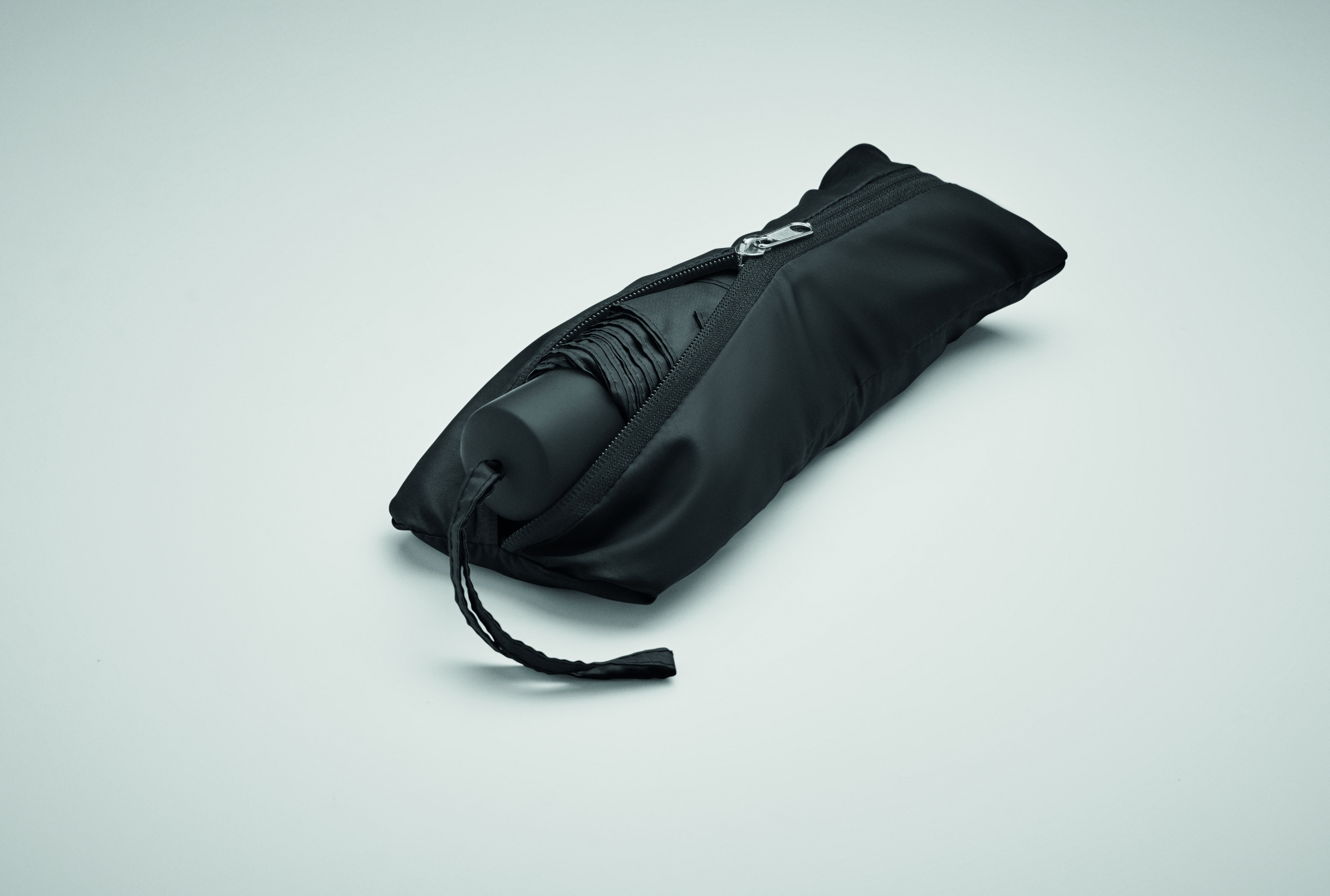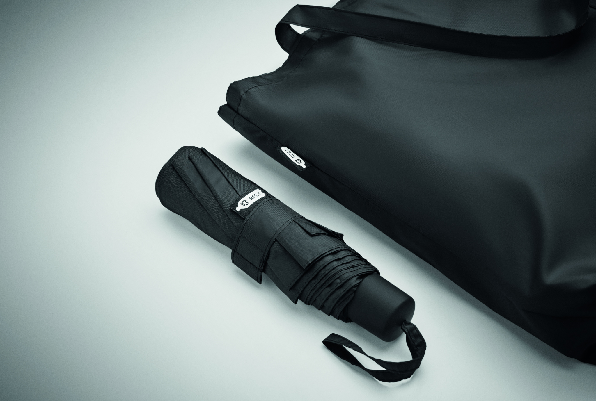 21 inch 3 fold manual open and closure windproof umbrella in 190T RPET pongee. Includes tote bag pouch. Has hidden zippered compartment to hold umbrella and keep bag contents dry. When bag is not in use, it rolls up and zipper compartment acts as the umbrella sleeve.