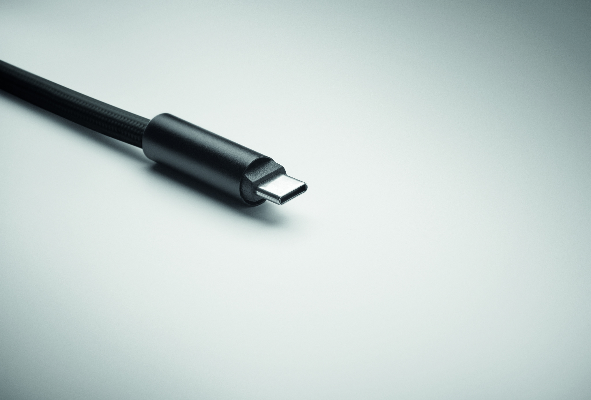 Cord lanyard with 60W charging and data transfer cable type-C to type-C in RPET with phone cord holder and key clip.