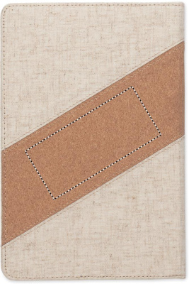2 in 1 notebook. A5 notebook with integrated wireless charger 15W. Features cotton and cork details on cover, 128 lined paper (64 sheets). Ribbon bookmark.