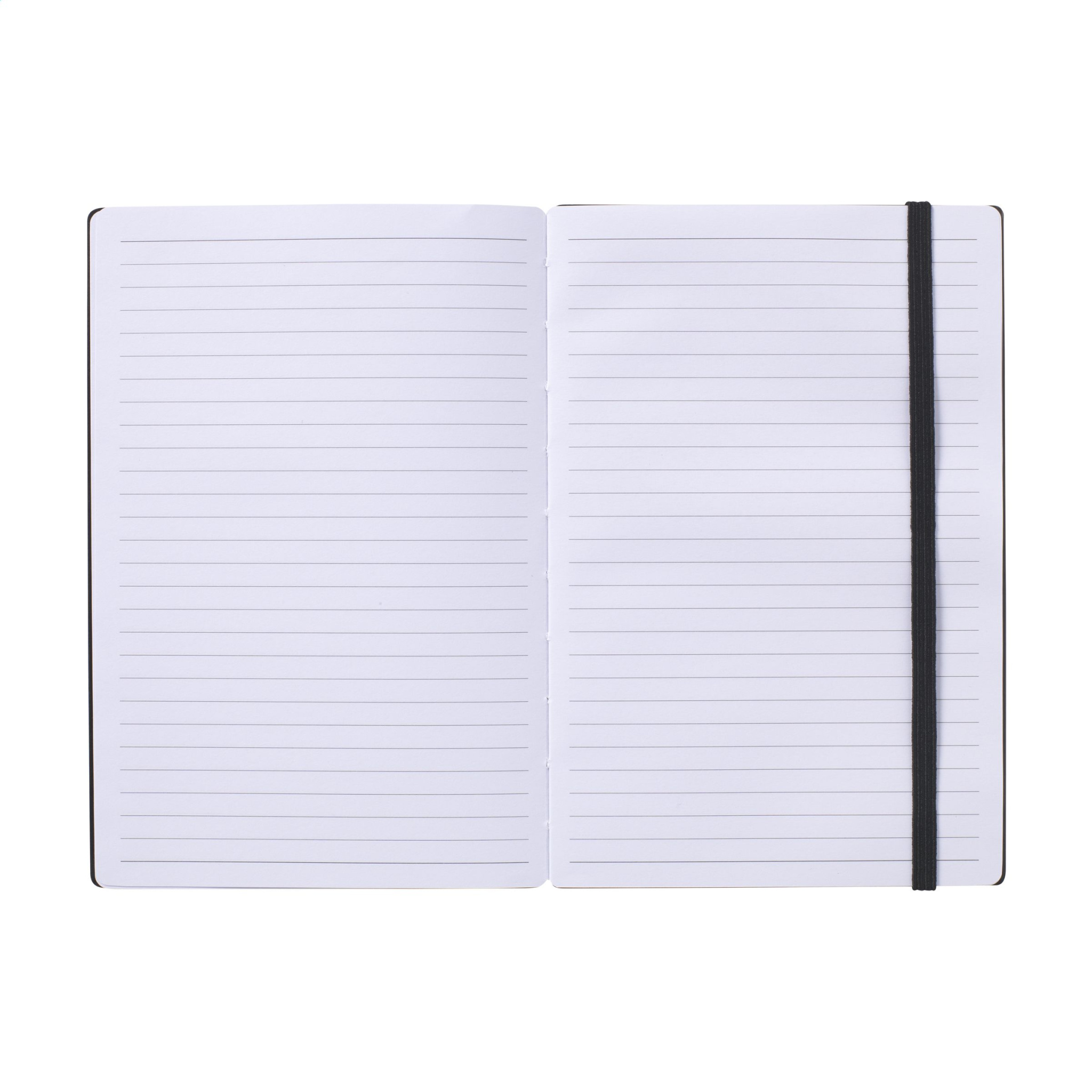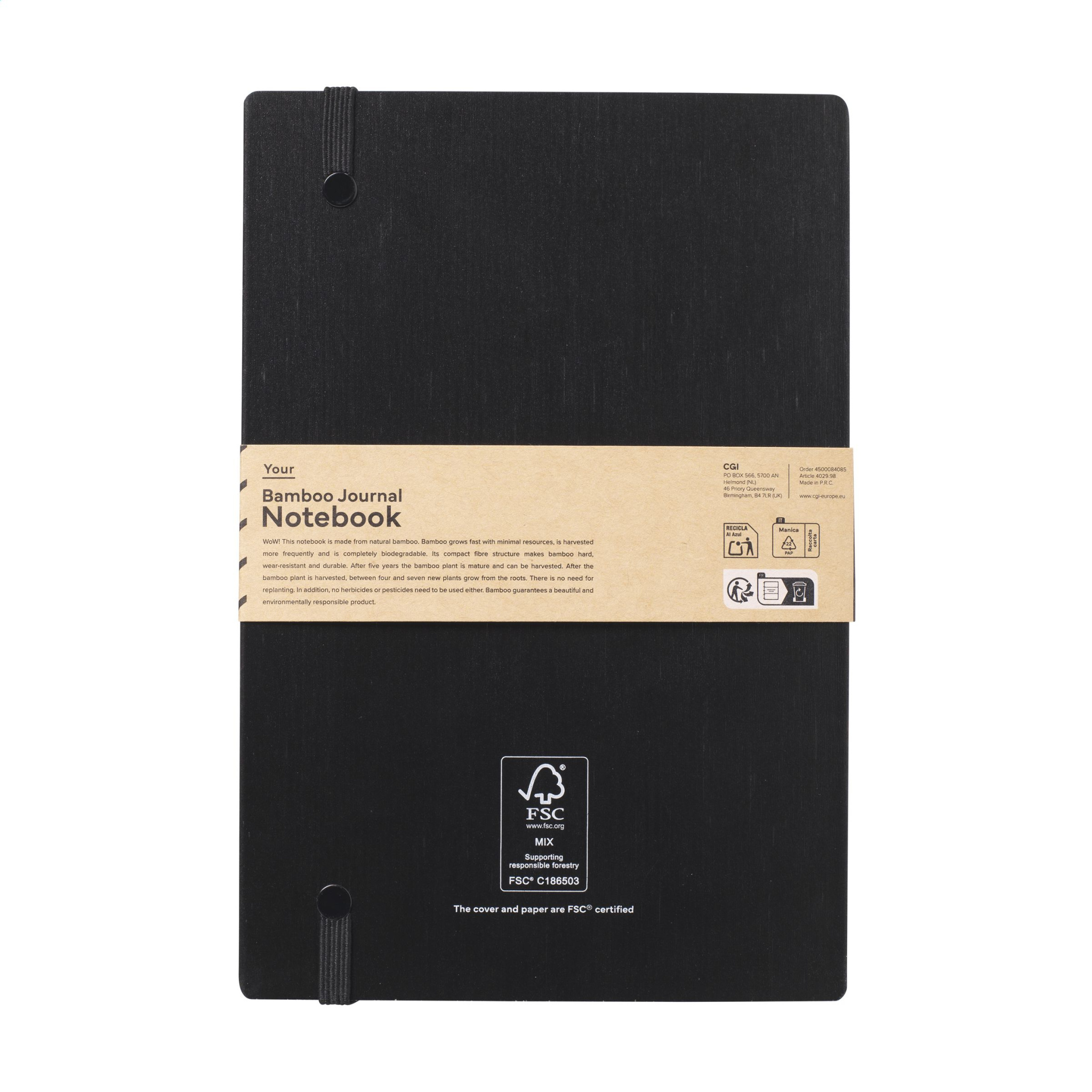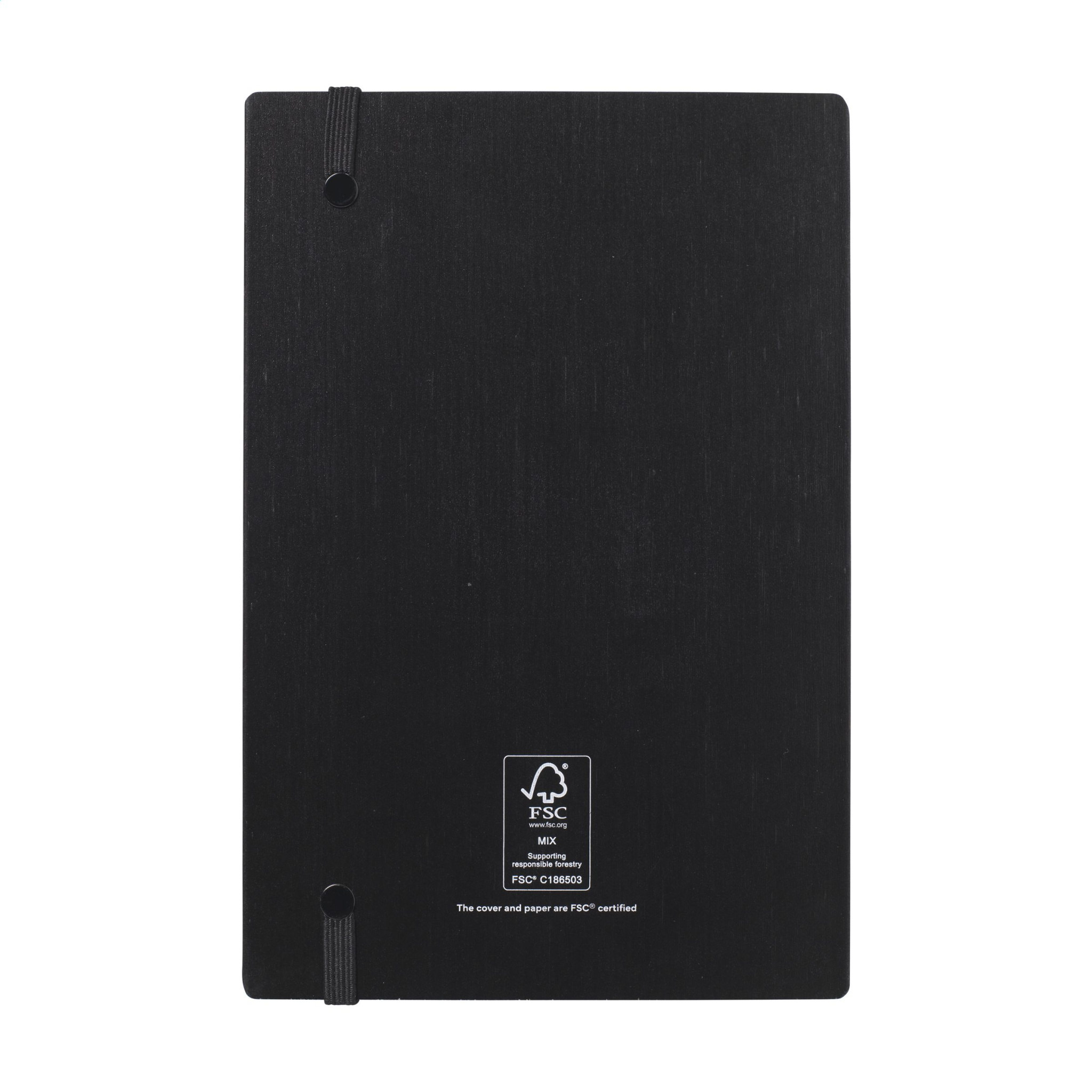 Блокнот формата A5 с прочной, черной лакированной бамбуковой обложкой, сертифицированной FSC 100%. С открытым корешком. Эта особенность специально разработана для того, чтобы открытый блокнот лежал максимально ровно. Это значительно облегчает запись заметок и зарисовок. С эластичной застежкой и примерно 96 листами/192 страницами белой, линованной, сертифицированной FSC Mix бумаги.
