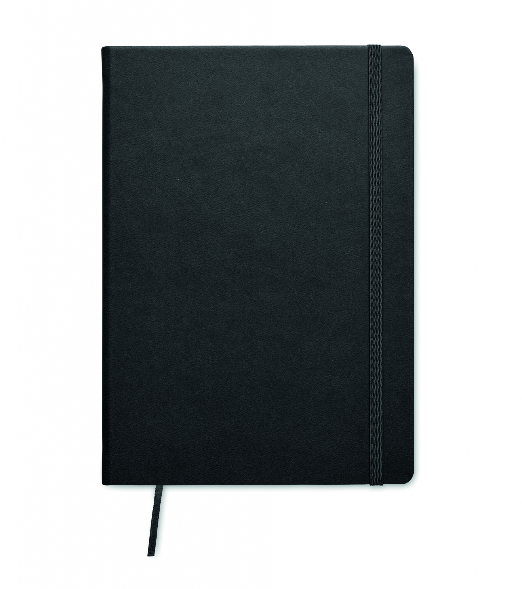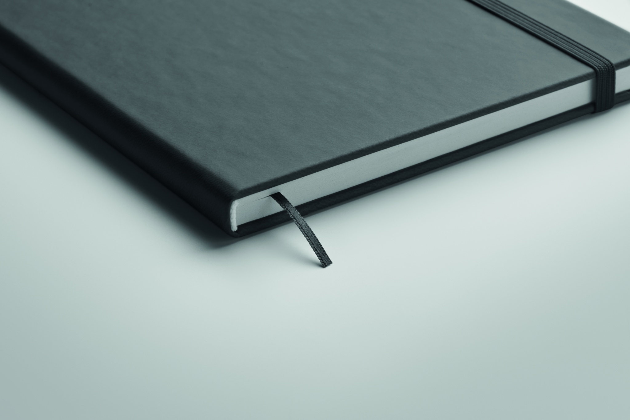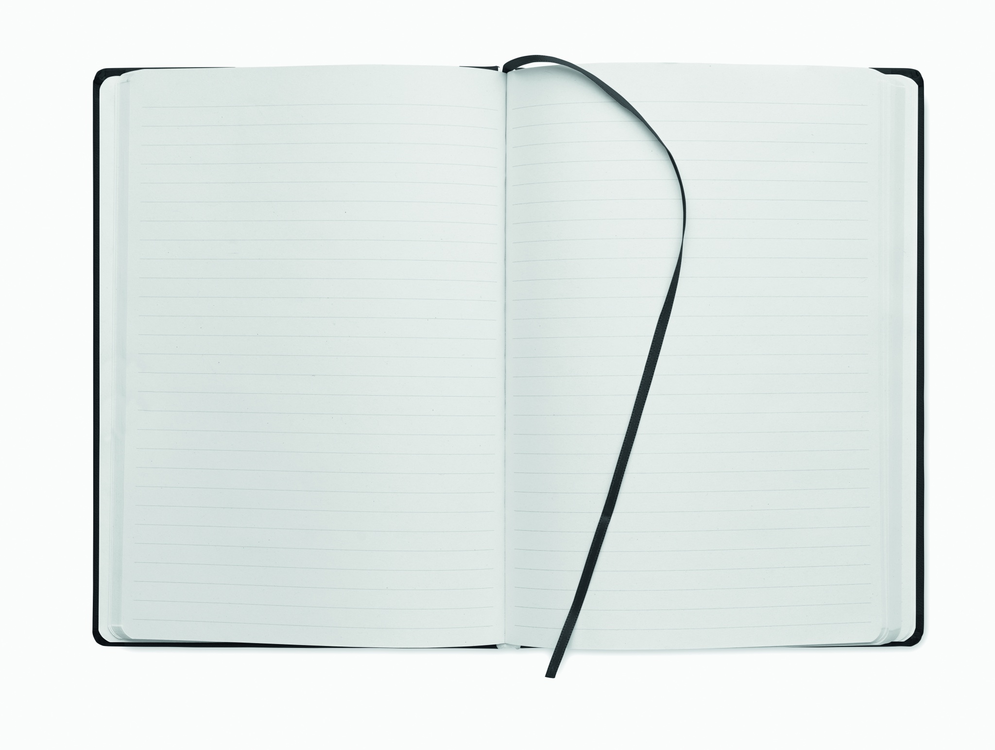 Блокнот формата A5 в твердой обложке из полиуретана. В переплете. 200 линованные страницы (100 листов) из переработанной бумаги (80 гсм). Закладка для страниц. Сделано в ЕС.
