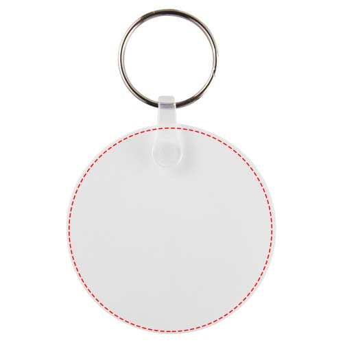 Брелок белого цвета круглой формы с металлическим разъемным кольцом для ключей. Металлическая петля для крепления кольца представляет собой плоский профиль, что делает его идеальным для пересылки.