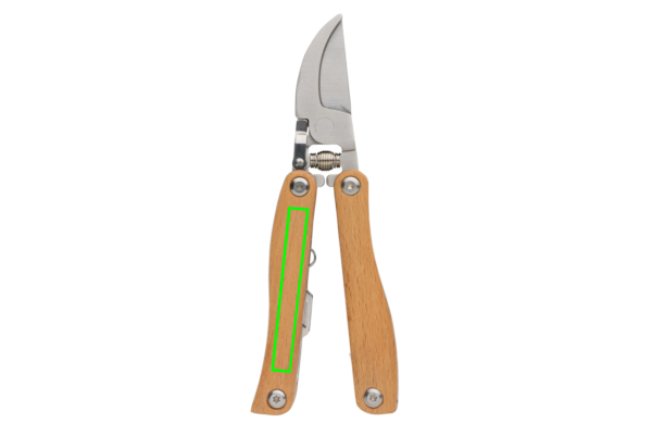 Садовый многофункциональный инструмент из 100% древесины бука FSC, нержавеющей стали высокой твердости и коррозионной стойкости (420). Твердость по Роквеллу 42-52. Изделие поставляется с 10 функциями: садовые секаторы, замок, плоская отвертка, напильник, корчерез, нож, лопата, пила, крюк для удаления сорняков, инструмент для прополки. Упаковано в коробку FSC mix kraft.