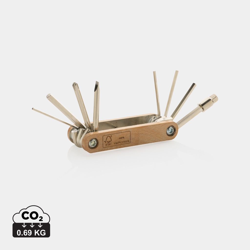 Шестигранный инструмент, изготовленный из 100% бука FSC и углеродистой стали высокой твердости и коррозионной стойкости (#45). Твердость по Роквеллу 40-45. Изделие поставляется с 9 функциями: шестигранный ключ 5,5 мм; шестигранный ключ 2 мм; шестигранный ключ 2,5 мм; шестигранный ключ 3 мм; шестигранный ключ 4 мм; шестигранный ключ 5 мм; шестигранный ключ 6 мм; отвертка Philips; плоская отвертка. Упаковано в коробку FSC mix kraft.