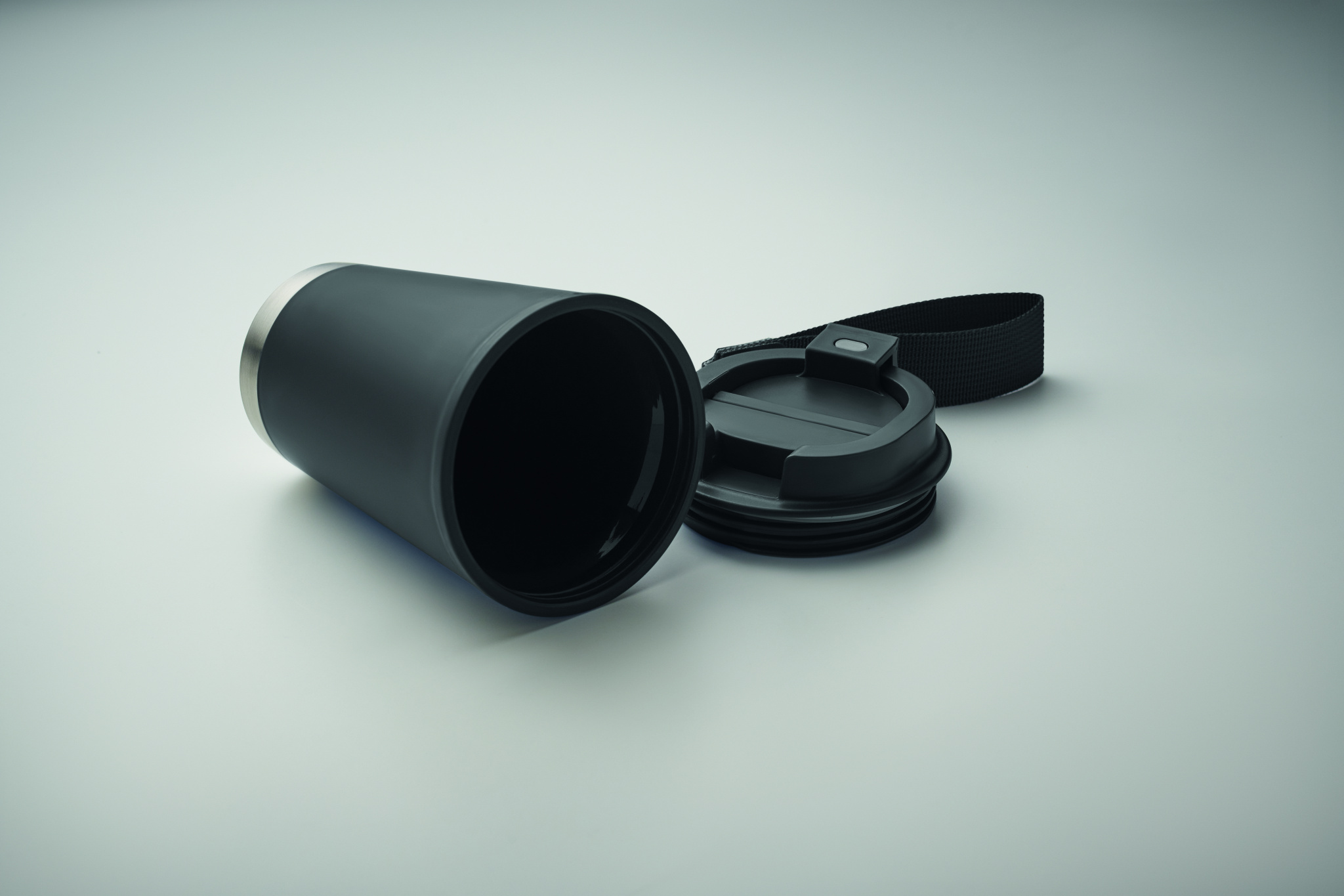 Double wall tumbler in PP inner wall, recycled PP outside wall, recycled stainless steel detail and RPET wrist strap. Capacity: 300 ml.
