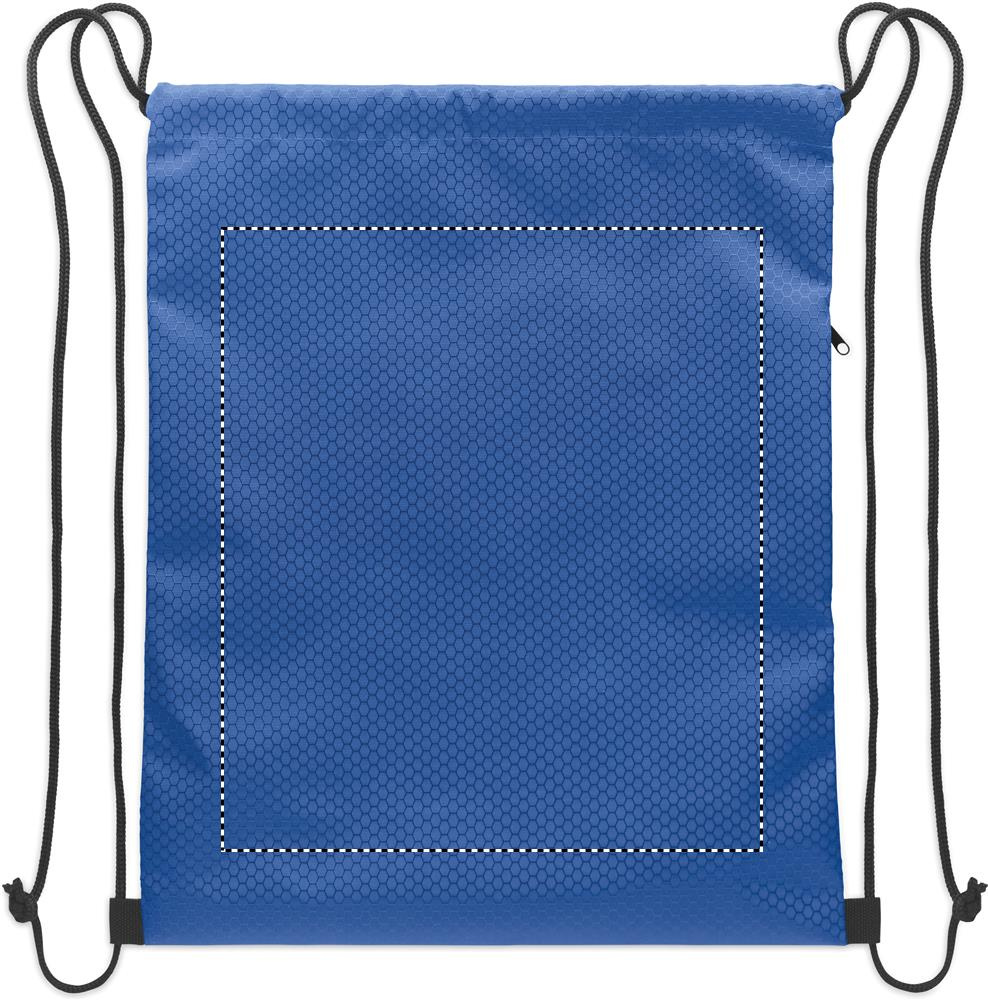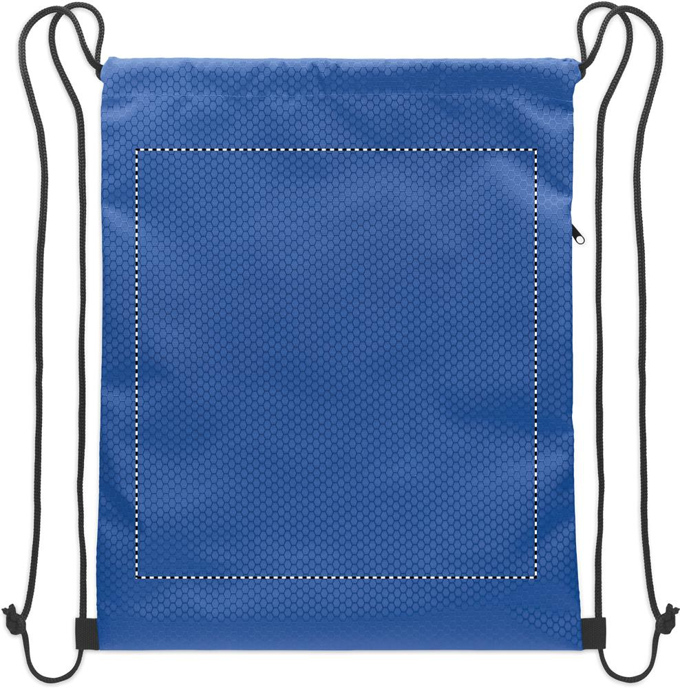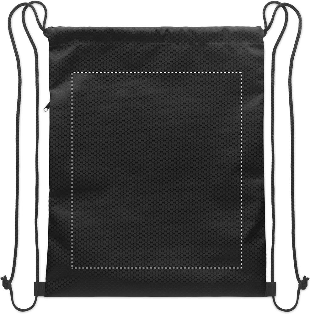 Drawstring bag in 420D RPET polyester with vertical side zip pocket and RPET 210D lining. Features durable cords on both sides. Capacity 4.5L, max load 5 kg.