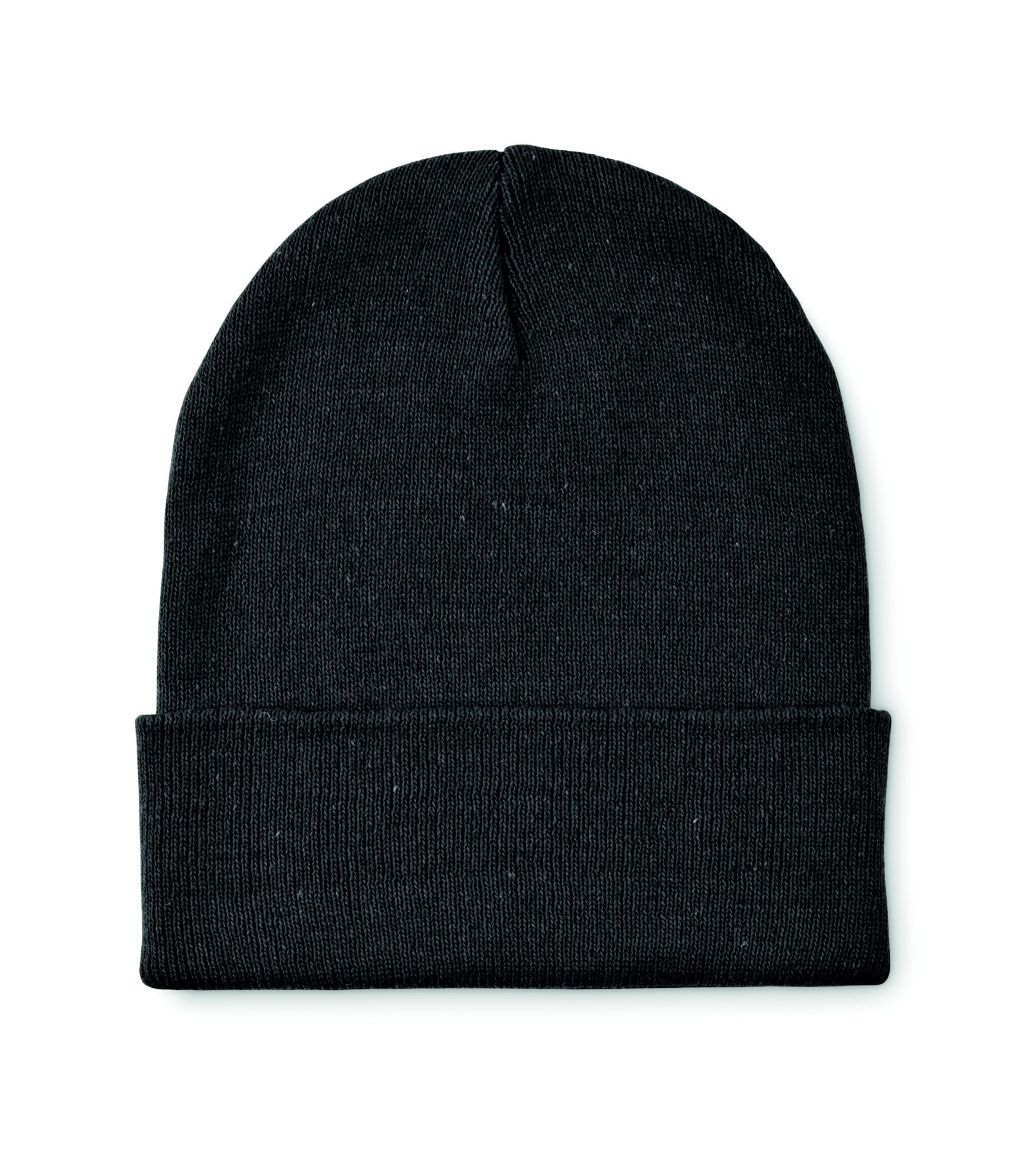 Unisex knitted beanie hat in soft stretchable polyester (64%) and acrylic (36%) with rolled up cuff. A stretchy one-size-fits-all design.
