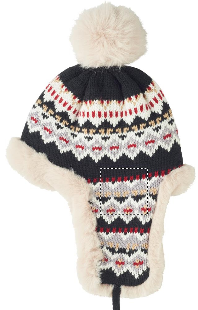 Knitted beanie with ear flaps and pompom in acrylic fibre with polyester and fleece lined. Includes label for printing area on one side. Adult size.