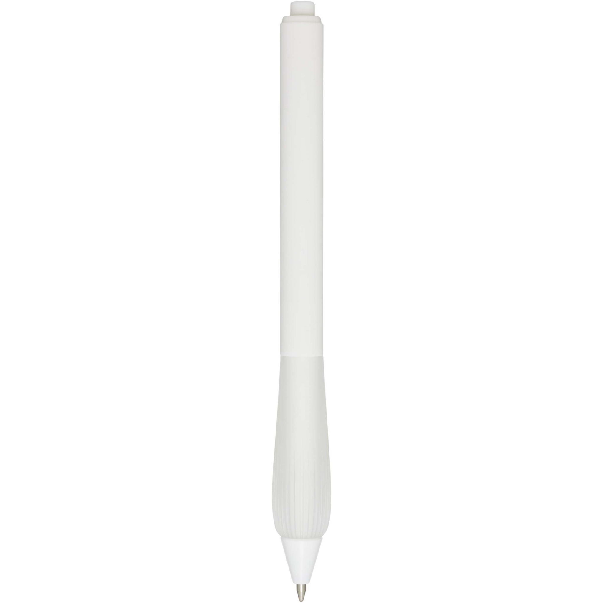 Шариковая ручка из переработанного пластика с прорезиненным корпусом и рукояткой из TPR. Цвет чернил: синий. Длина непрерывной линии: 1000 метров. Размер пера: 1,0 мм.