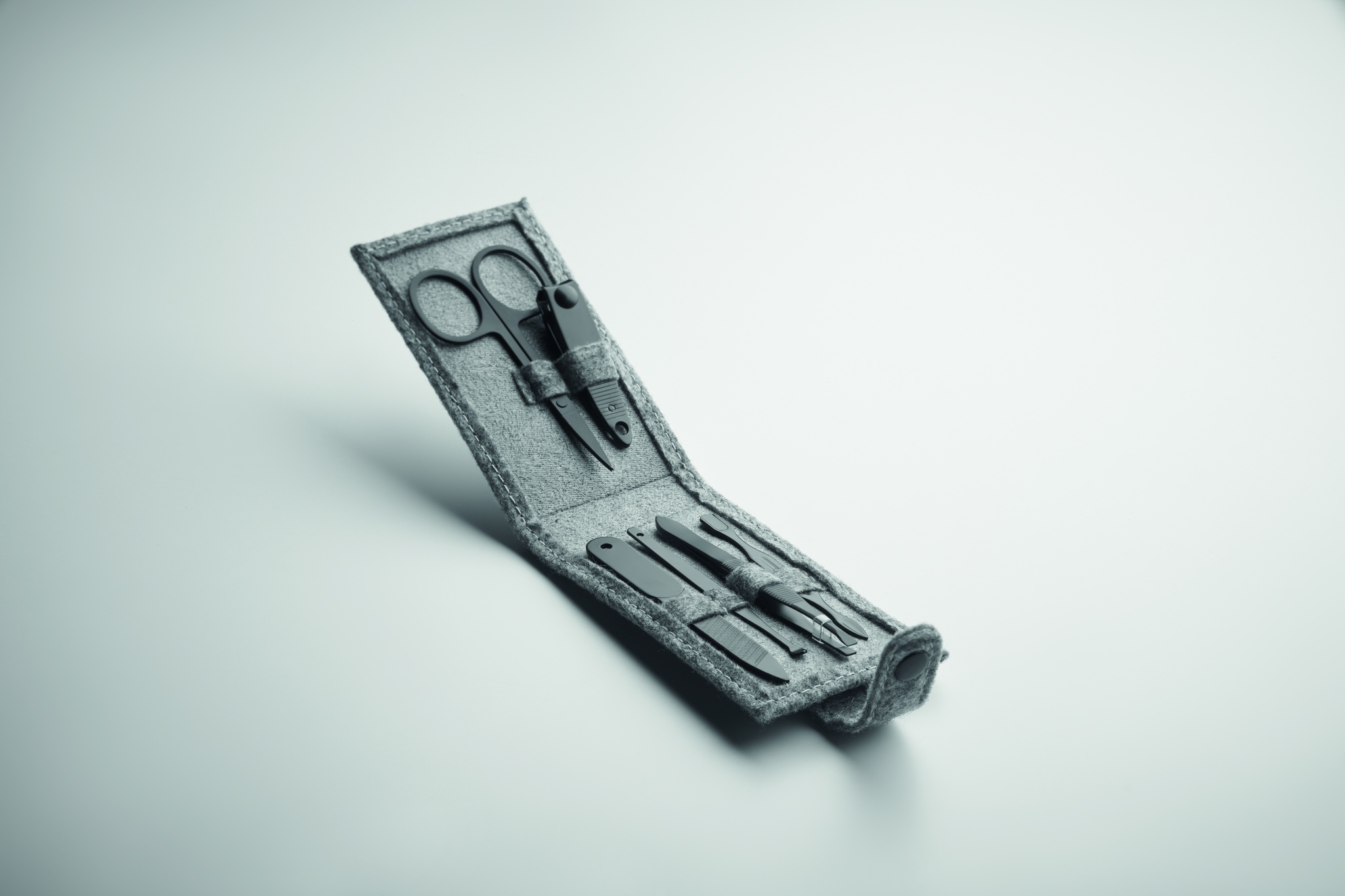Маникюрный набор из нержавеющей стали из 6 предметов в прямоугольном чехле из переработанного войлока RPET.