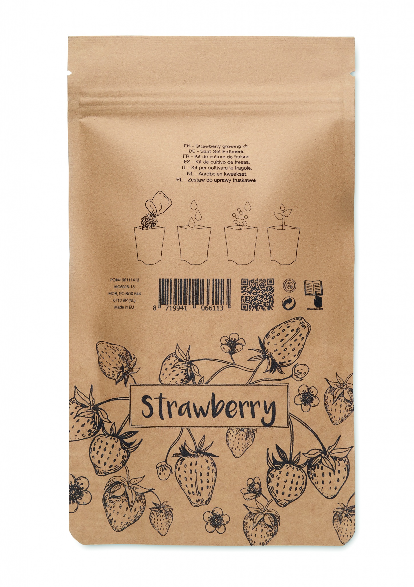 Набор для выращивания клубники, включающий садовый компост, в бумажной упаковке. Сделано в ЕС.