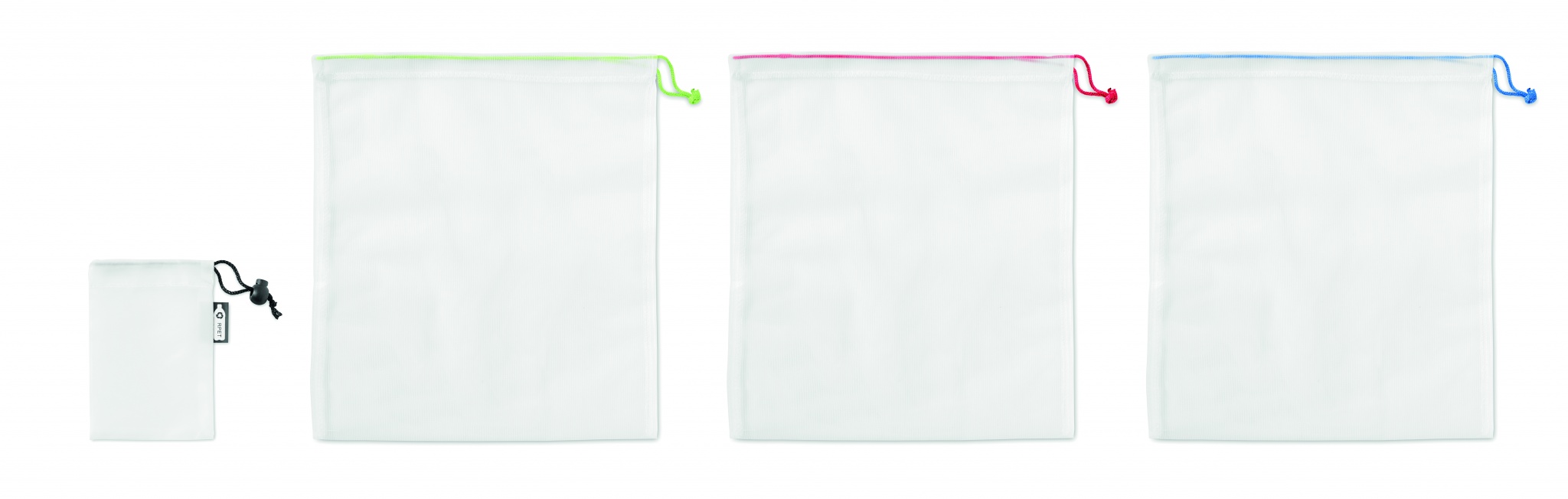 Набор из 3 сетчатых сумок из RPET . Закрывается кулиской. Можно стирать в стиральной машине. Не содержит BPA.