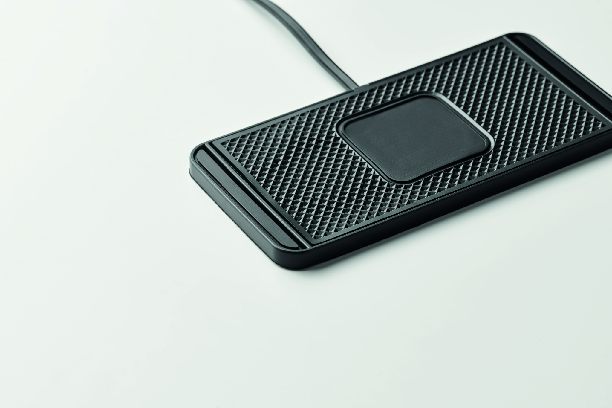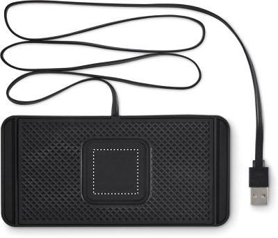 Car wireless charger 15W, anti slip pad in PVC. Adjustable as the edges can be cut to fit the required size. Integrated USB A cable, length 120 cm