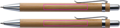 Письменный набор из бамбука, включающий синюю шариковую ручку и механический карандаш в картонном футляре. Мы гравируем ваш логотип под зажимом на обеих ручках.