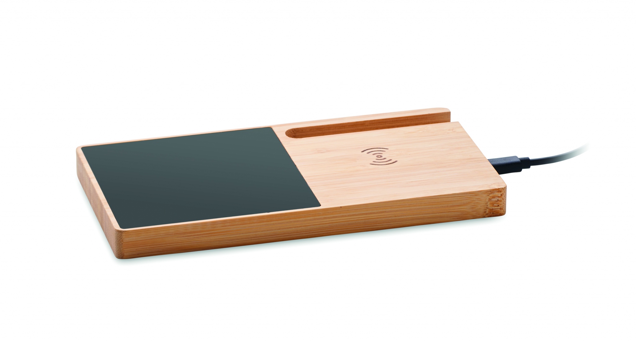 Беспроводное зарядное устройство из бамбука с подогревом кружки и подставкой для телефона. Подключите устройство к компьютеру, положите на него смартфон и дайте ему зарядиться. Выход: DC 9V/1.67A (15W). Совместимо с последними моделями андроидов, iPhone® 12, X и новее.