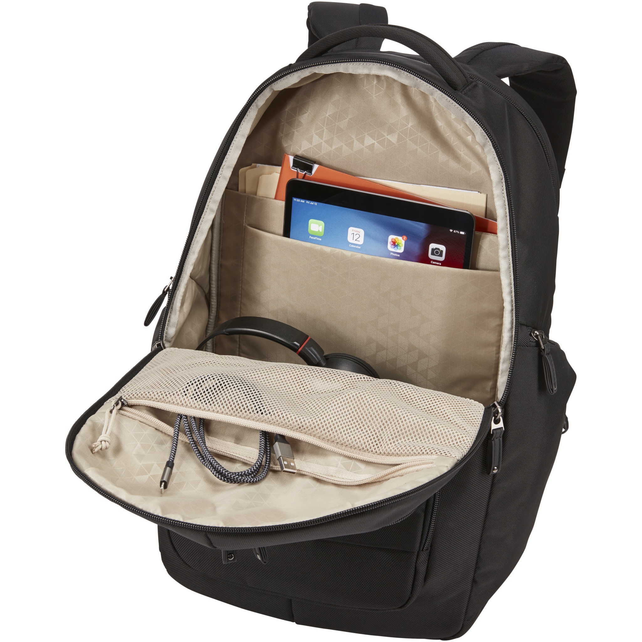 Имеет большое основное отделение на молнии с мягким чехлом для ноутбука 17,3" и планшета 10,1" и сетчатый карман на молнии для кабелей и аксессуаров. Поставляется с передней панелью-органайзером для хранения небольших электронных приборов, кабелей, аксессуаров, визитных карточек и ключей. Имеет расширяемые боковые карманы под бутылку с водой или блок питания, мягкие наплечные ремни, стеганую заднюю панель из сетки, мягкую ручку и рукав для фиксации на выдвижной ручке дорожной сумки. Гарантия от Case Logic: 25 лет.