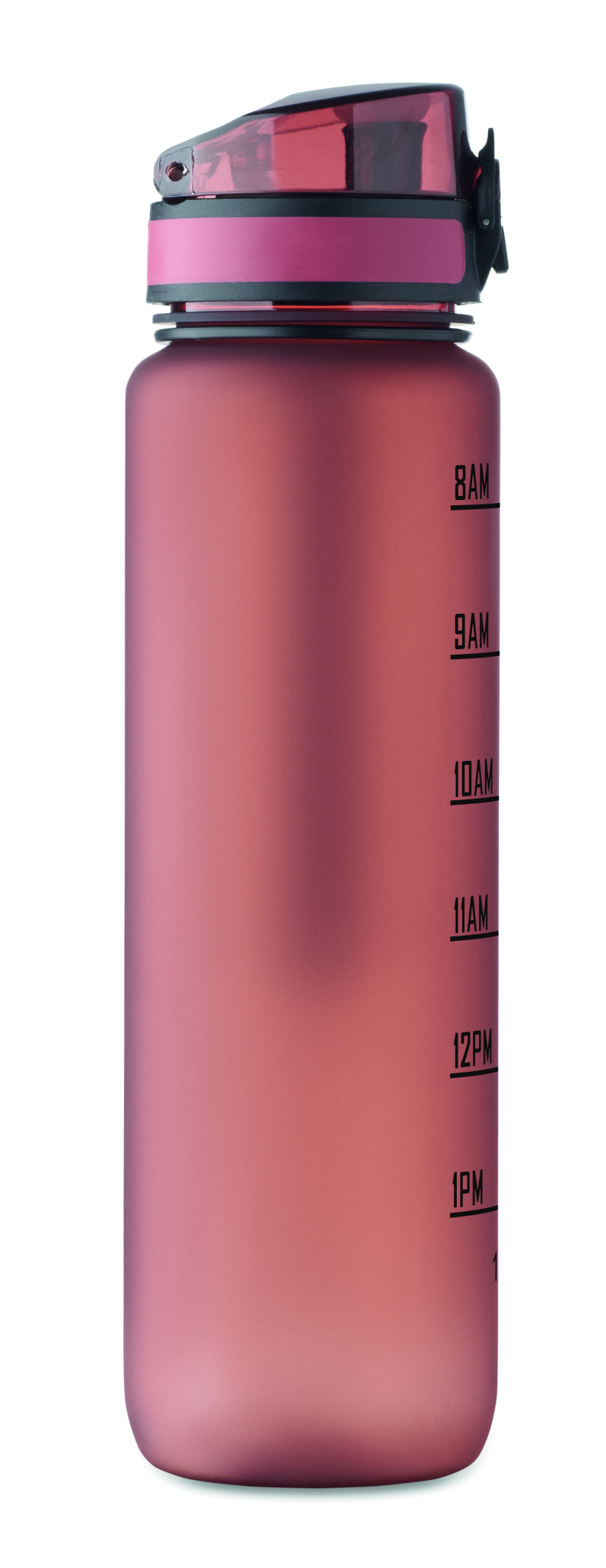 Sports water bottle in RPET, motivational time markings, one hand opening flip top lid, safety lock and carrying strap. Leak-free. Capacity: 1L.