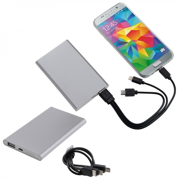 Алюминиевый внешний аккумулятор емкостью 4000 мАч, индикатором заряда, многоконтактным кабелем для зарядки (Lightning, USB Type C и Micro-USB). Ваш логотип будет выгравирован.