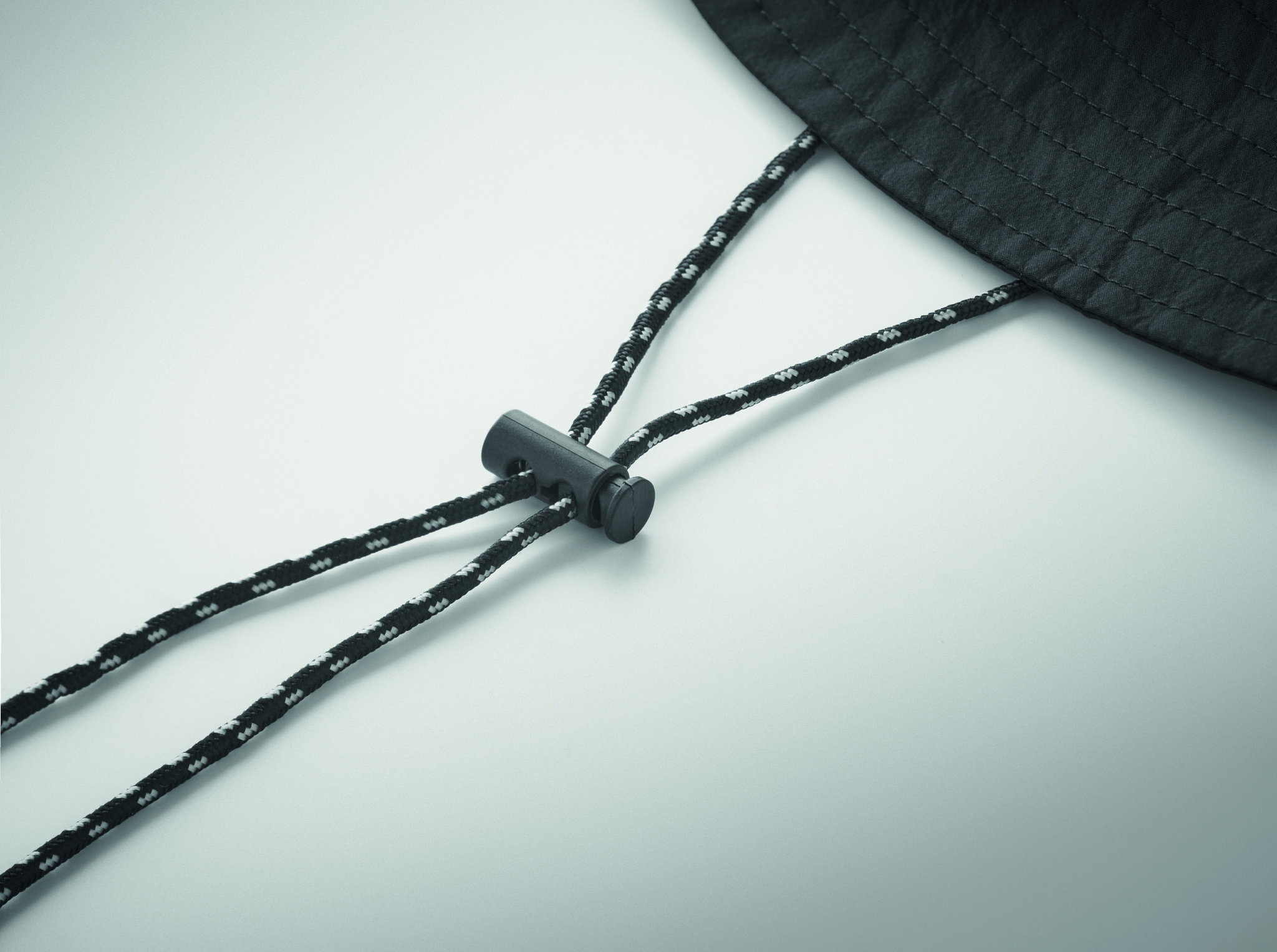 Water repellent fisherman hat made of polyester, includes self material pouch with ABS carabiner. 64 gr/m².
