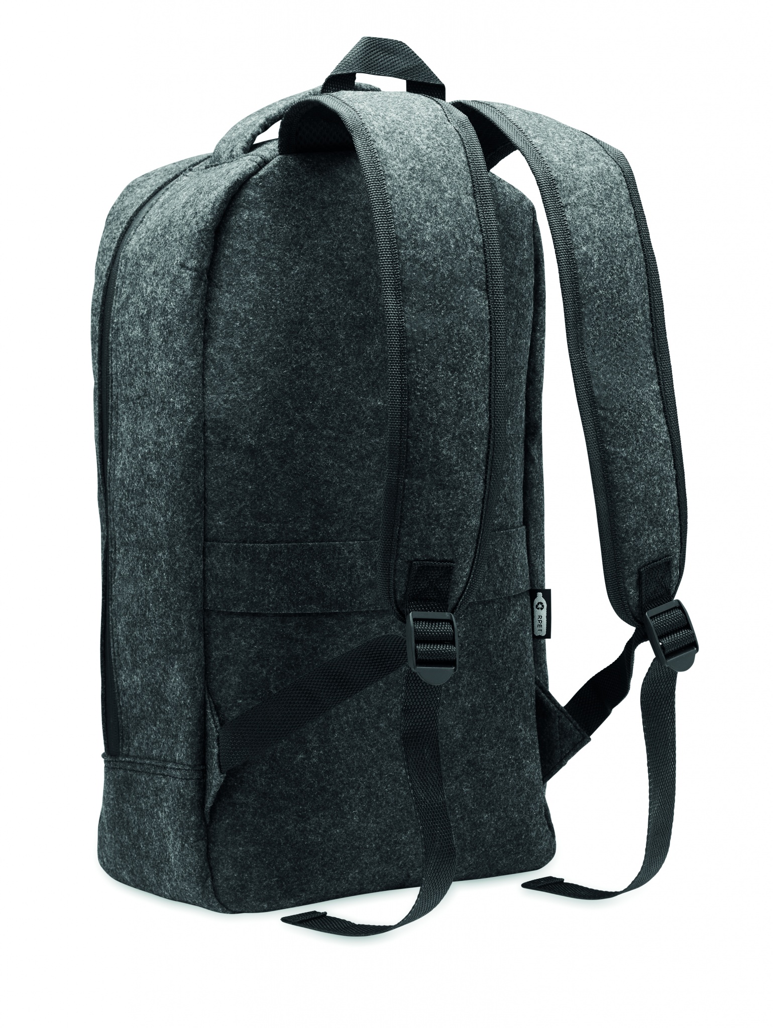 13-tums laptopryggsäck i RPET-filt med vadderad axelrem och rem samt ett stort innerfack. Fack med dragkedja på baksidan för bättre skydd och säkerhet.
