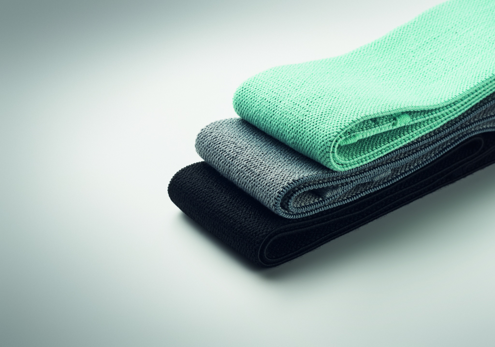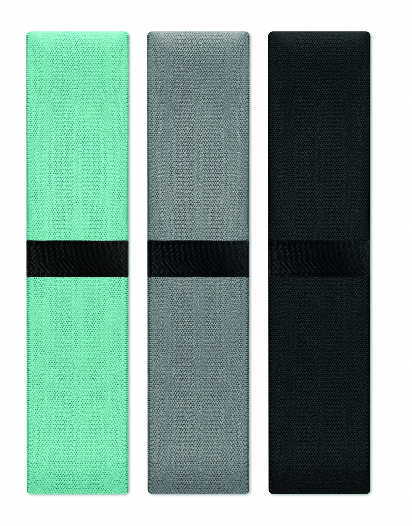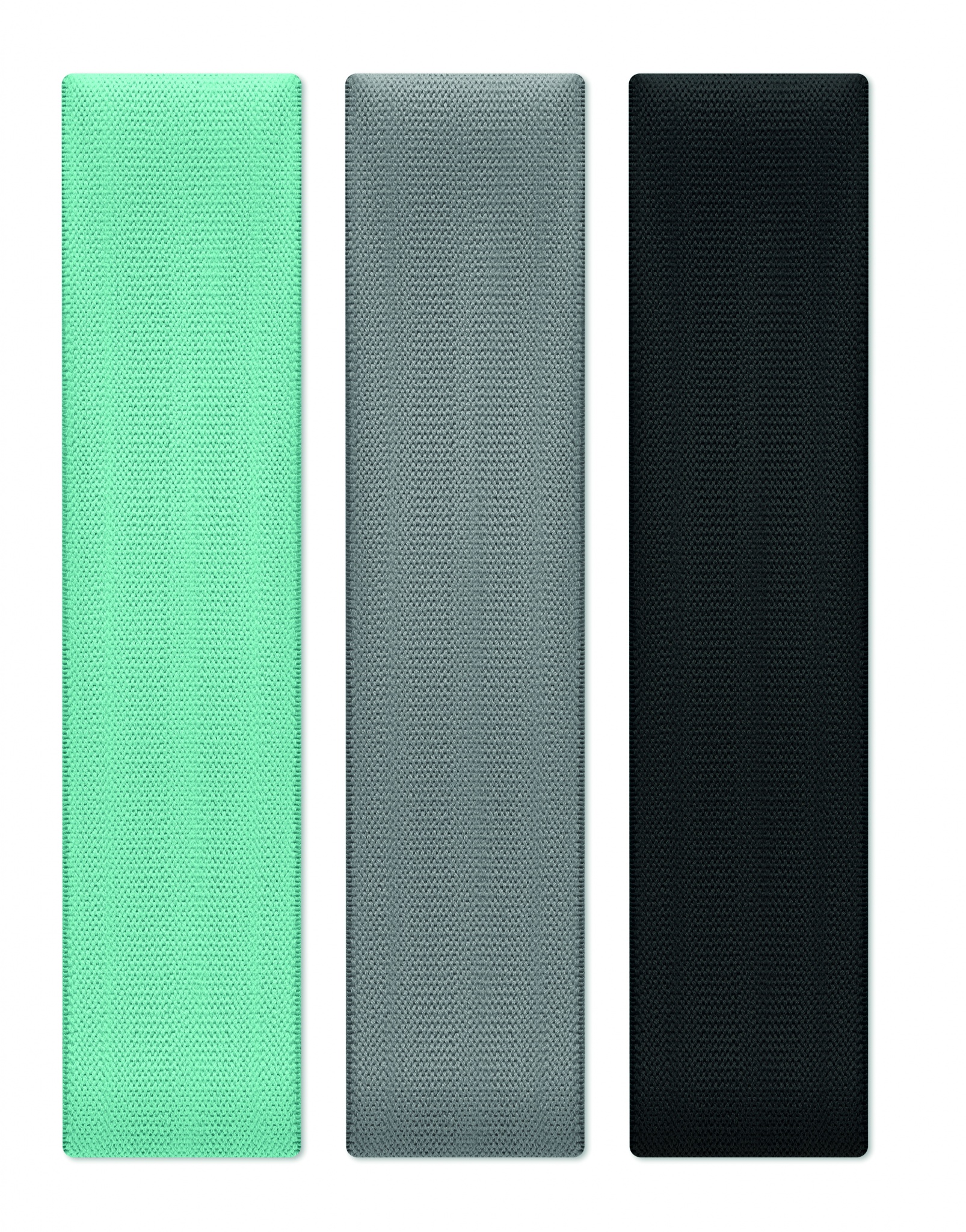 Set med 3 fitnessband i terylen, bomull och latexsilke i en RPET-påse. Fitnessbanden har alla olika styrka för optimal träning.
