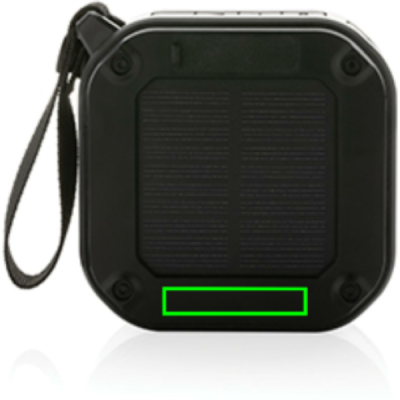 Kraftfull 3W trådlös högtalare med integrerad solcellspanel på baksidan tillverkad av RCS-certifierad återvunnen ABS. Totalt återvunnet innehåll: 38% baserat på total produktvikt. RCS-certifiering garanterar en helt certifierad leveranskedja för de återvunna materialen. Högtalaren använder monokristallina solcellspaneler av hög kvalitet med 19% konverteringsgrad. Laddningshastigheten beror på förhållandena. Laddningshastighet solenergi: 5V/80mA. Högtalaren är utrustad med ett 400 mAh-batteri som ger upp till 5 timmars speltid och BT5.3 för smidig anslutning och klart ljud. Räckvidd upp till 10 meter. Med mikrofon och funktion för att besvara samtal. Med integrerat LED-ljus med 30 lumen. Levereras i FSC mix FSC®-box. Laddningskabel i RCS-certifierad återvunnen TPE medföljer. Produkten och tillbehören är 100% fria från PVC. IPX 5 vattentät.