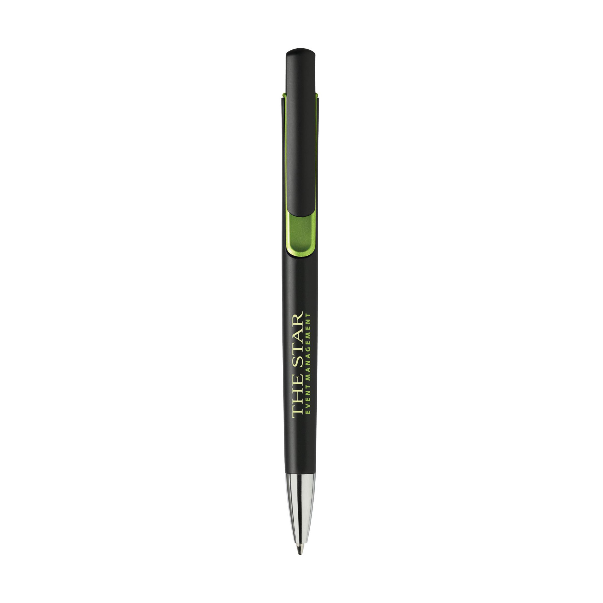 Kulspetspenna med blått bläck med matt svart cylinder, enastående designad klämma och detaljer i metalliskt utseende.