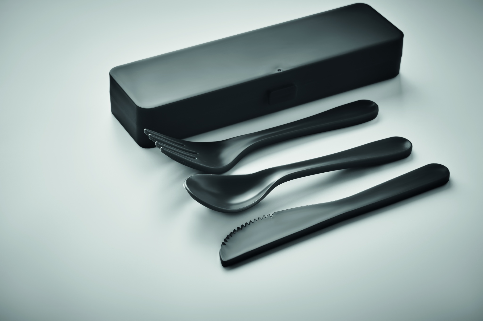 Återanvändbar PP-bestickset och fodral för att enkelt ta med sig. Innehåller sked, gaffel och kniv.