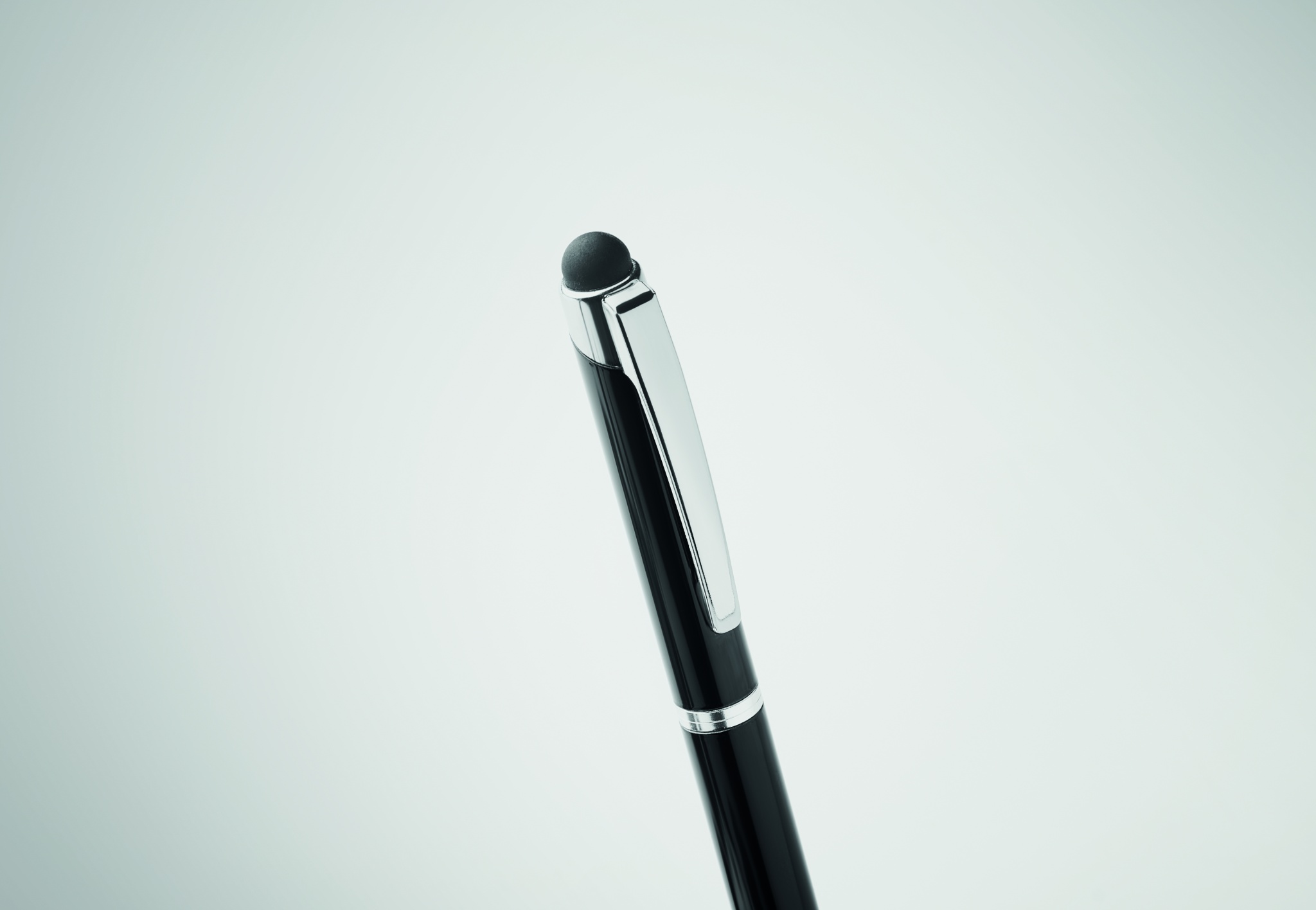 Kulspetspenna i återvunnen aluminium med vridmekanism och stylus. Blått bläck.