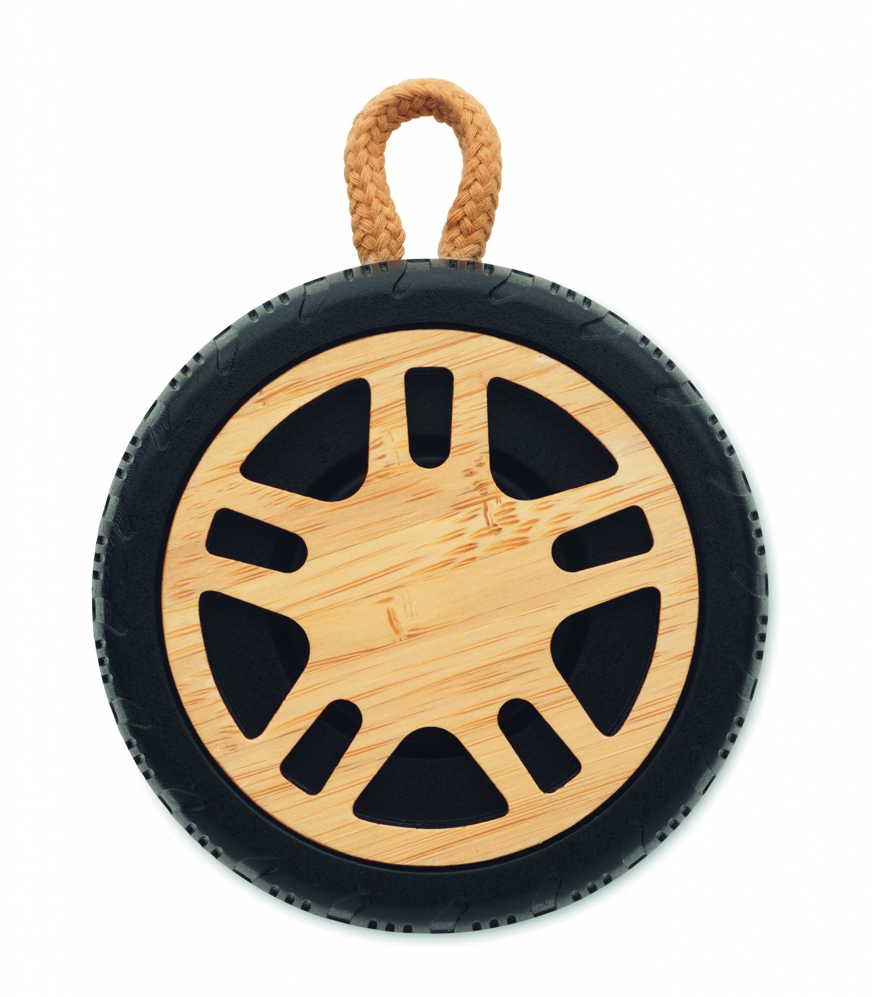 Däckformad trådlös 5.3-högtalare i återvunnen ABS med detaljer i bambu och handtag i bomullsrep. Uppladdningsbart batteri på 400 mAh.